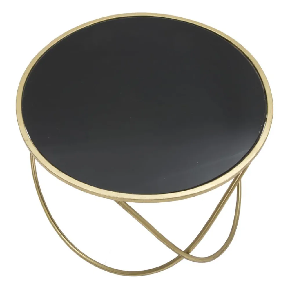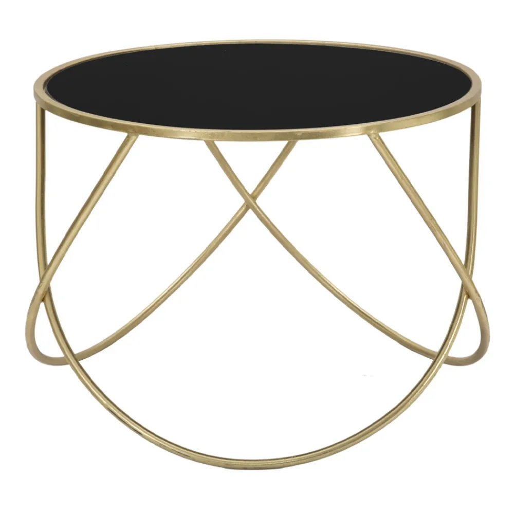 Runder Couchtisch aus schwarzem Glas mit goldener Eisenstruktur.