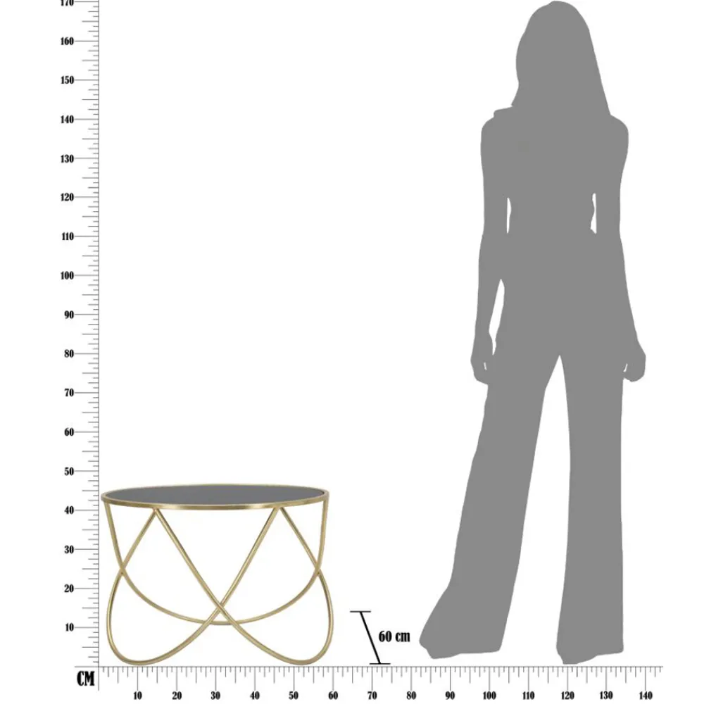 Couchtisch mit goldfarbener Eisenstruktur mit runder schwarzer Glasplatte . Eine Ergänzung, die sich durch ein einfaches und vielseitiges Design auszeichnet, aber gleichzeitig exklusiv und avantgardistisch. Seine Einzigartigkeit wird durch die perfekte Kombination aus dem Hauch von Eleganz des goldenen Sockels und dem raffinierten Element des schwarzen Glases verliehen. Auffallend an seiner Ästhetik ist die Verwendung von weichen Formen und geschwungenen Linien , die einen raffinierten und eklektischen Couchtisch zum Leben erwecken, der sich dank seiner Vielseitigkeit und seines zeitgenössischen Charakters jeder modernen stilistischen Situation anpassen kann.