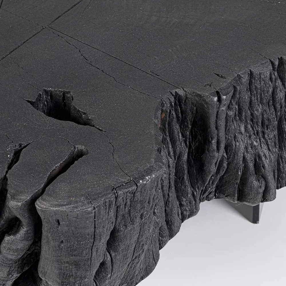 Niedriger Tisch für das Wohnzimmer aus Stahl und Stamm aus schwarzem Akazienholz.