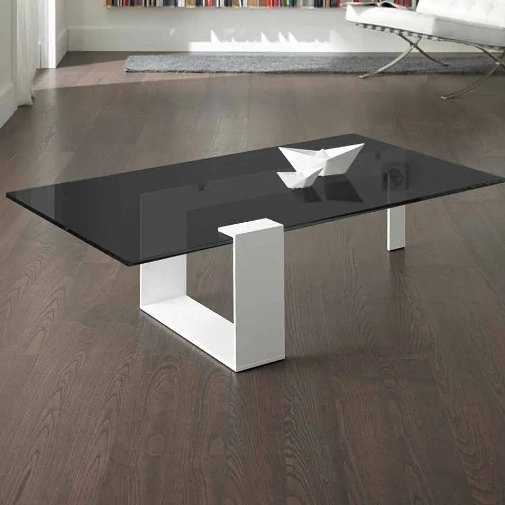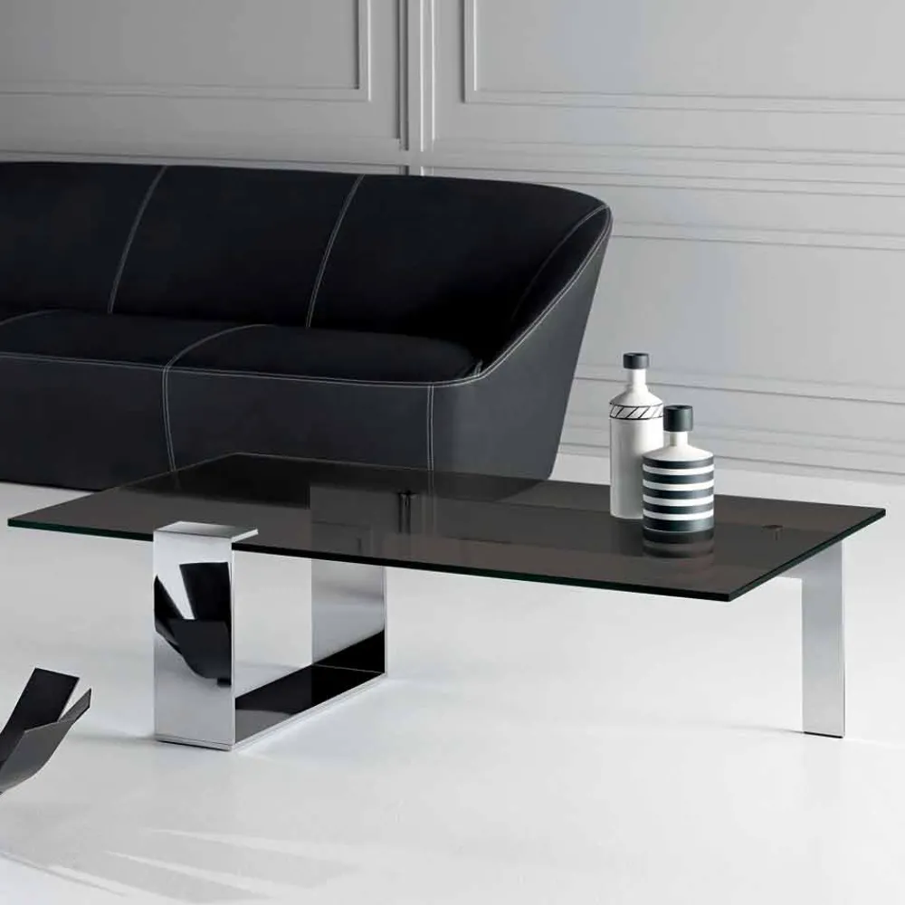 Rechteckiger Couchtisch im modernen Design mit Rauchglasplatte und Metallbasis, hergestellt in Italien.