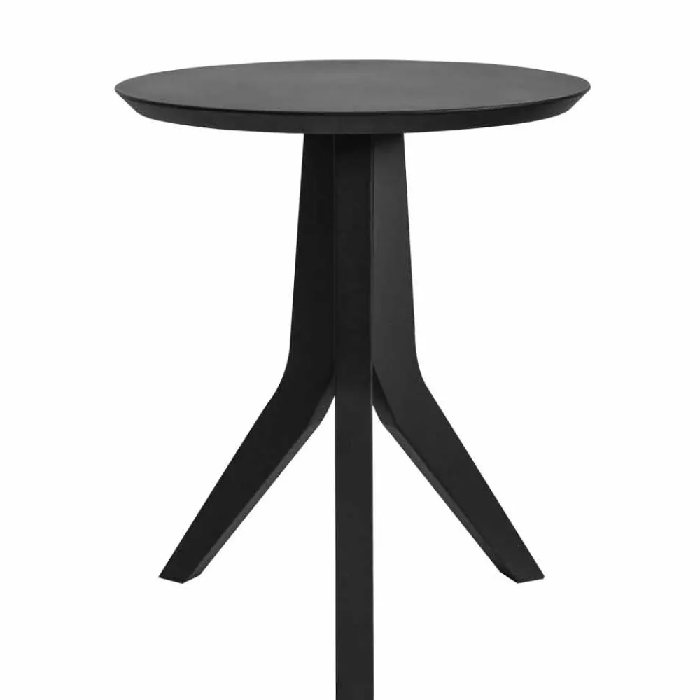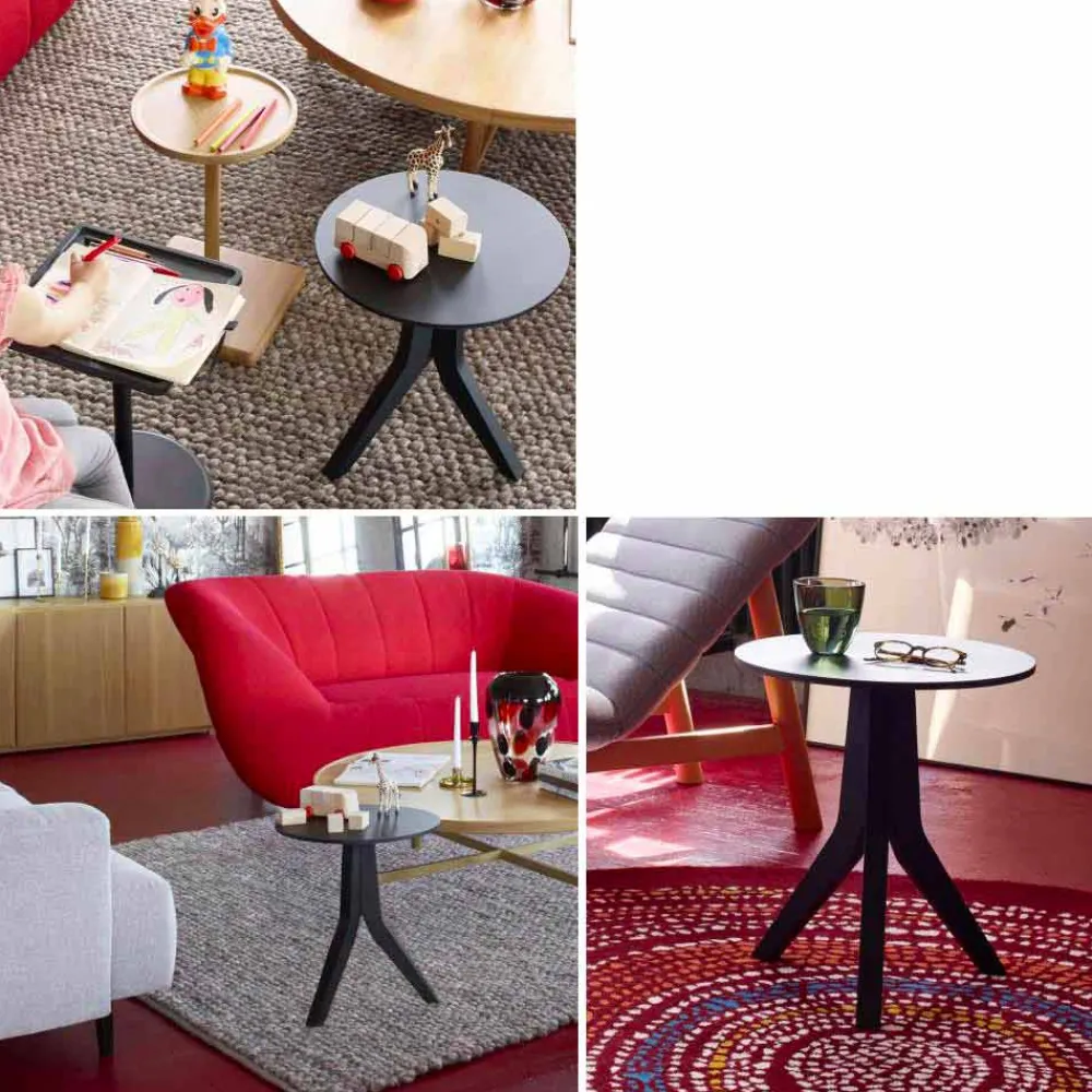 Die feste Buchenholz Basis mit quadratischen Beinen unterstützt eine runde MDF Oberseite mit einem Durchmesser von 40 cm.