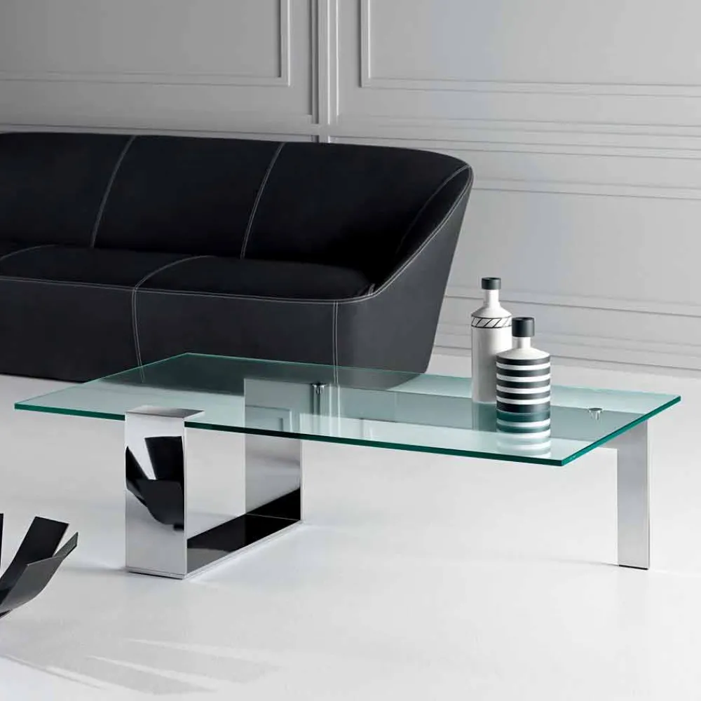 Niedriger Couchtisch im modernen Design mit extra klarer Glasplatte und Metallbasis, hergestellt in Italien.