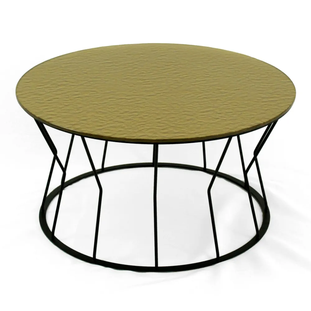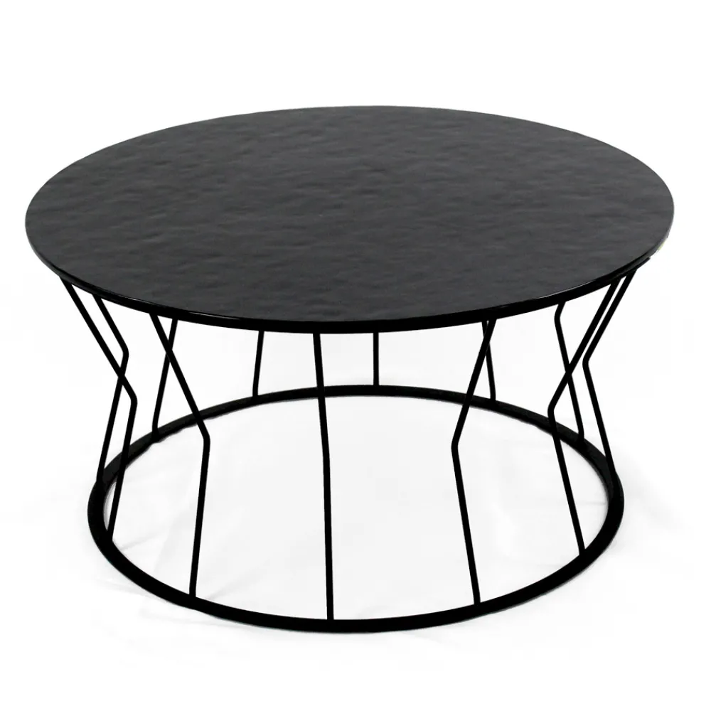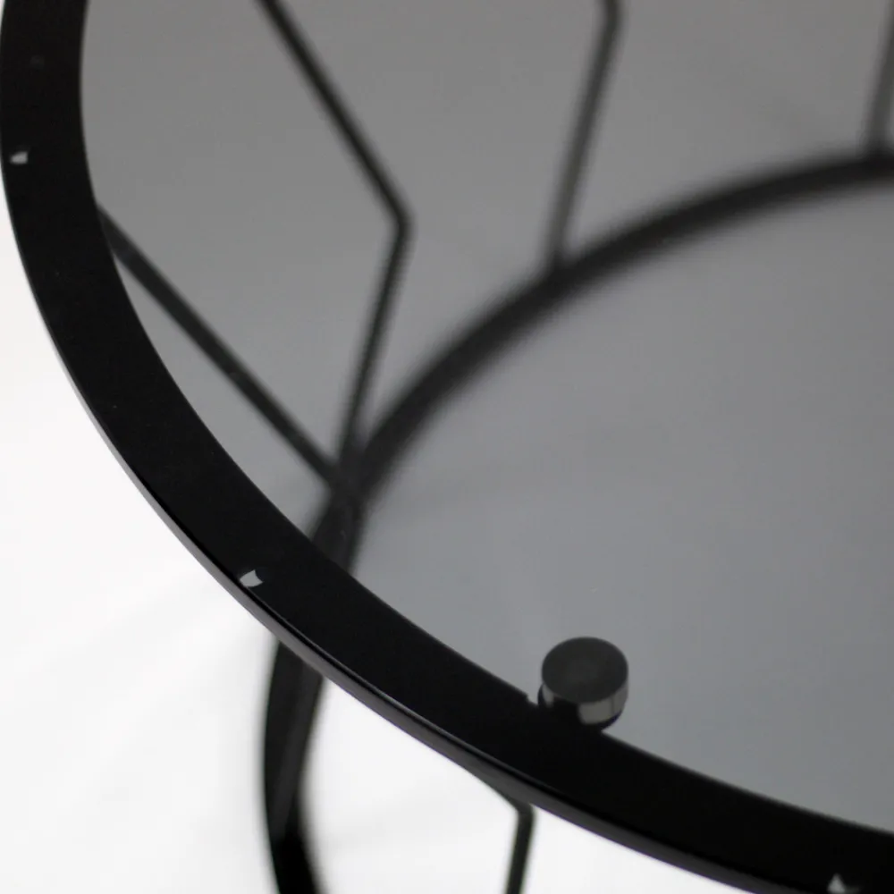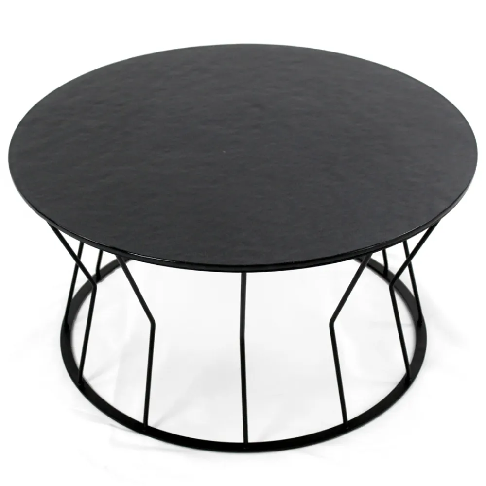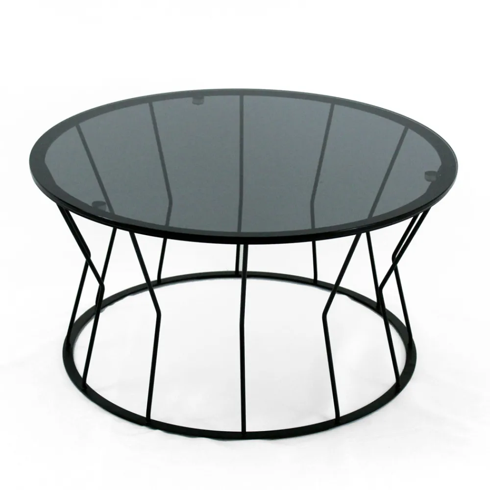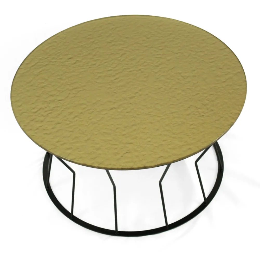 Runder Couchtisch mit lackiertem Stahlsockel und Glasplatte.