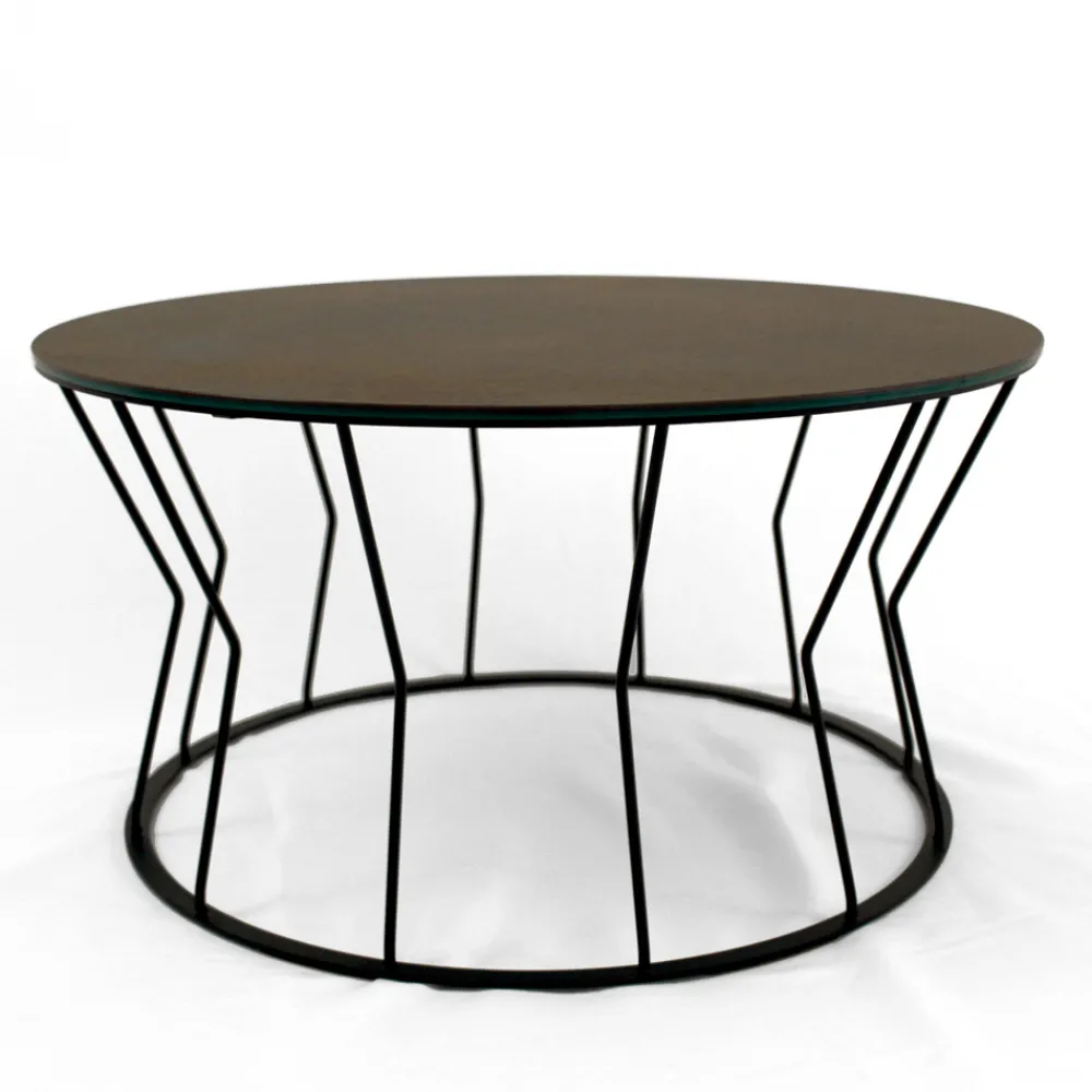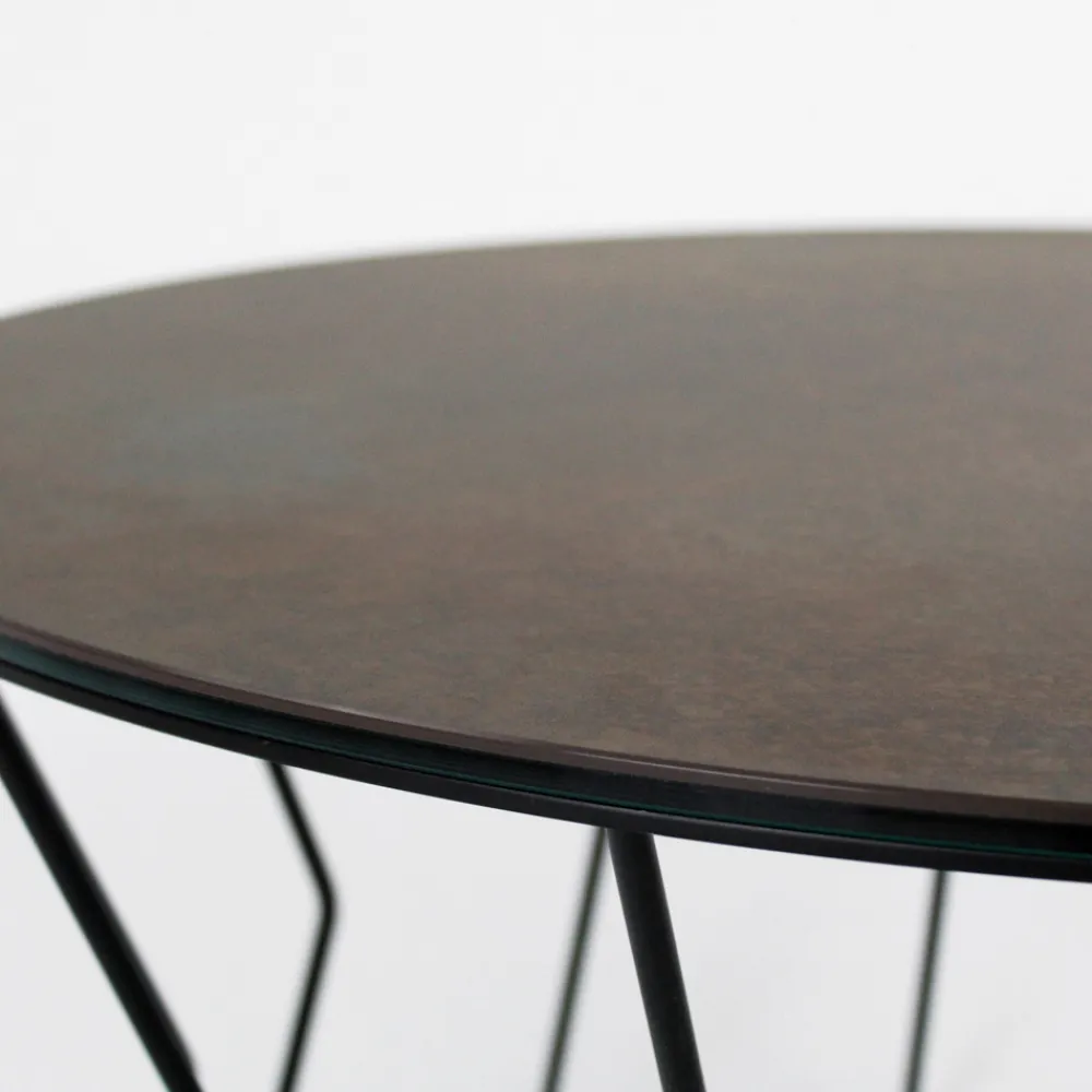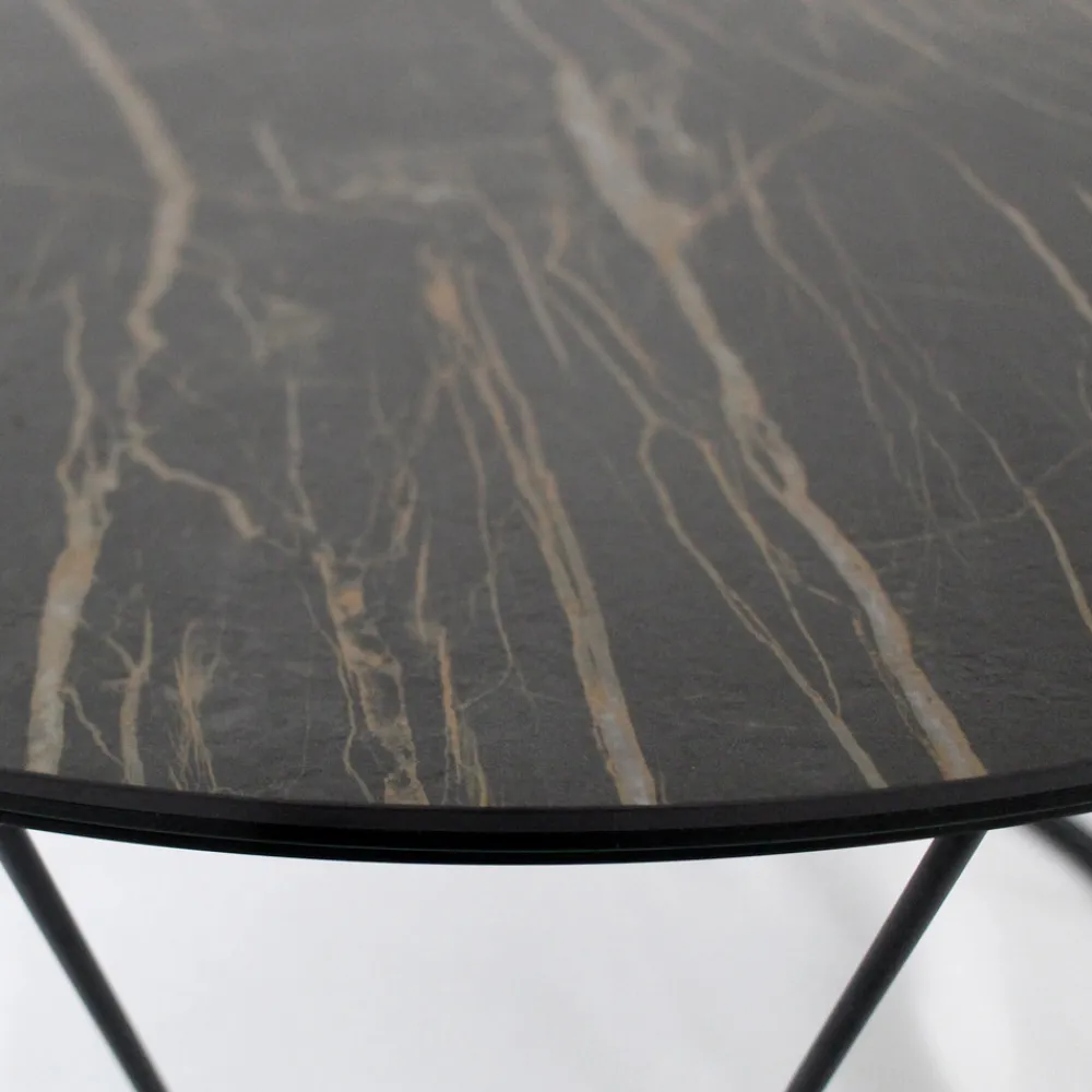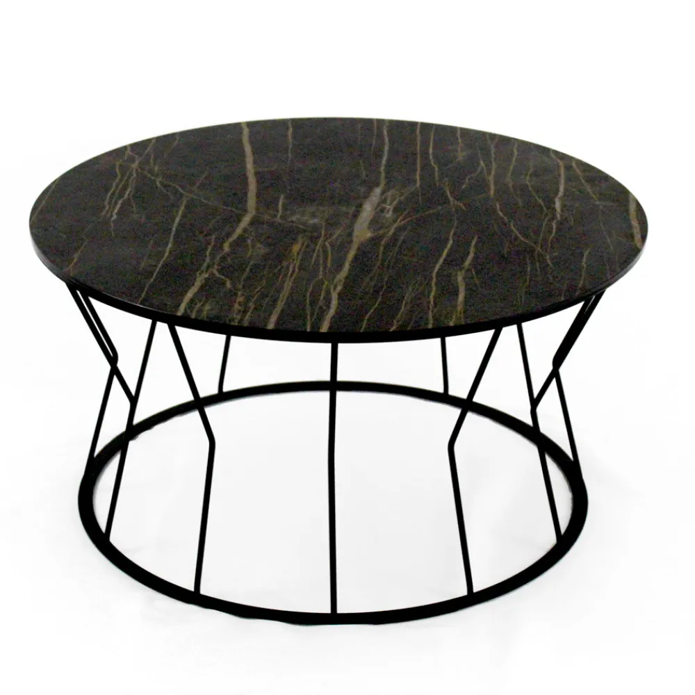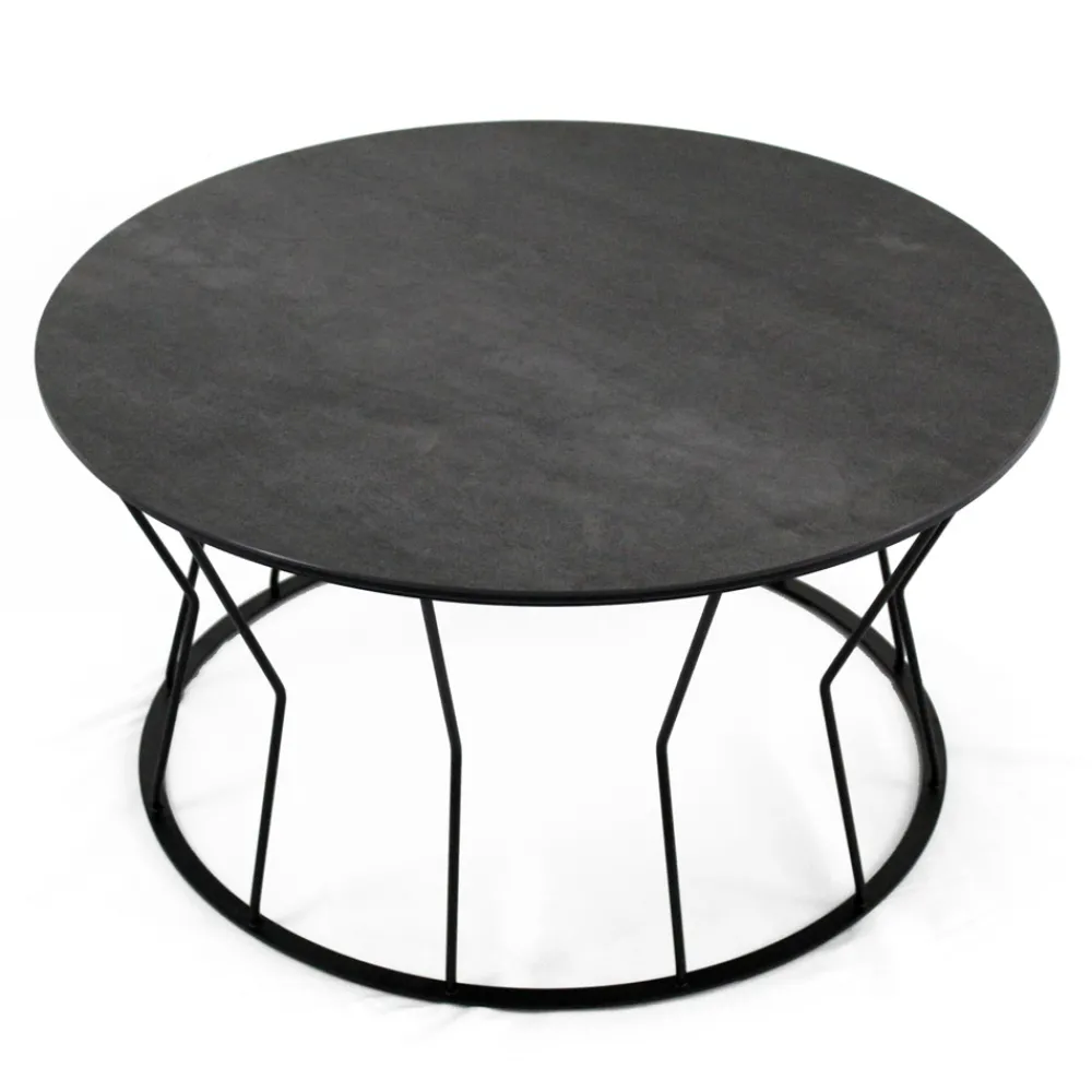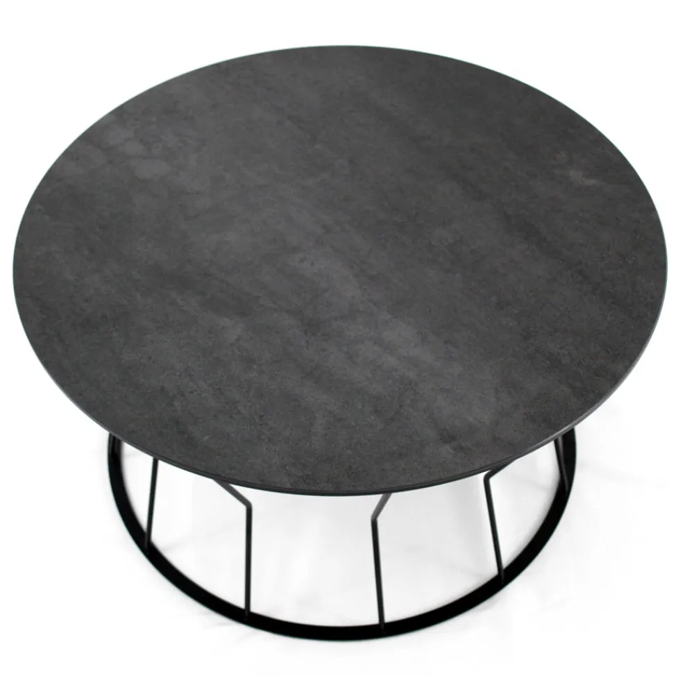 Runder Couchtisch mit lackiertem Stahlsockel und Platte aus Feinsteinzeug.