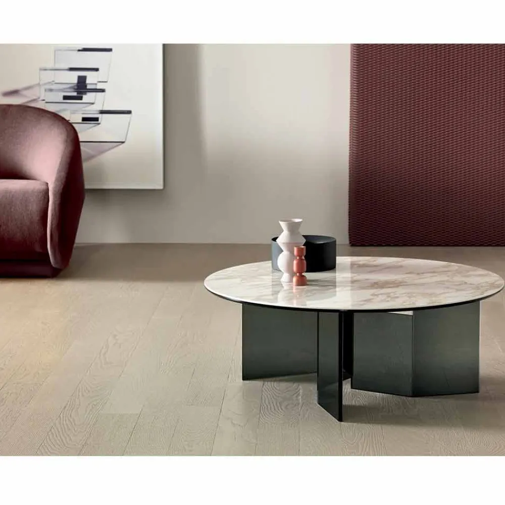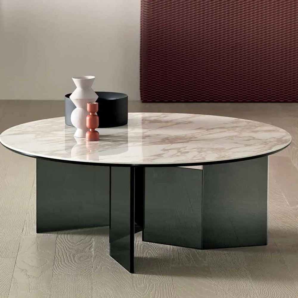 Runder Couchtisch mit Keramikplatte und Rauchglasbeinen, feines Produkt made in Italy.