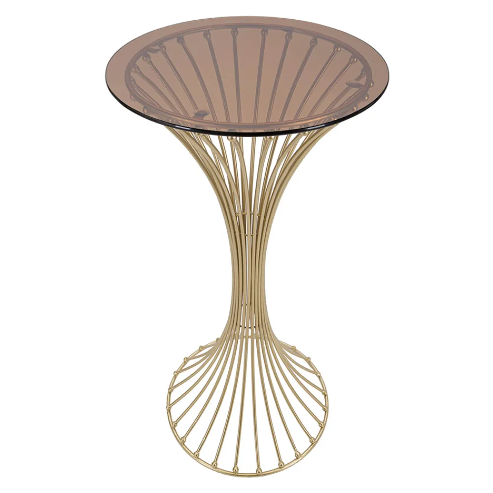 Hoher Tisch aus goldfarbenem Eisen mit einfachen und weichen Linien, verziert mit eleganten Kugeln und komplett mit Rauchglasplatte.
