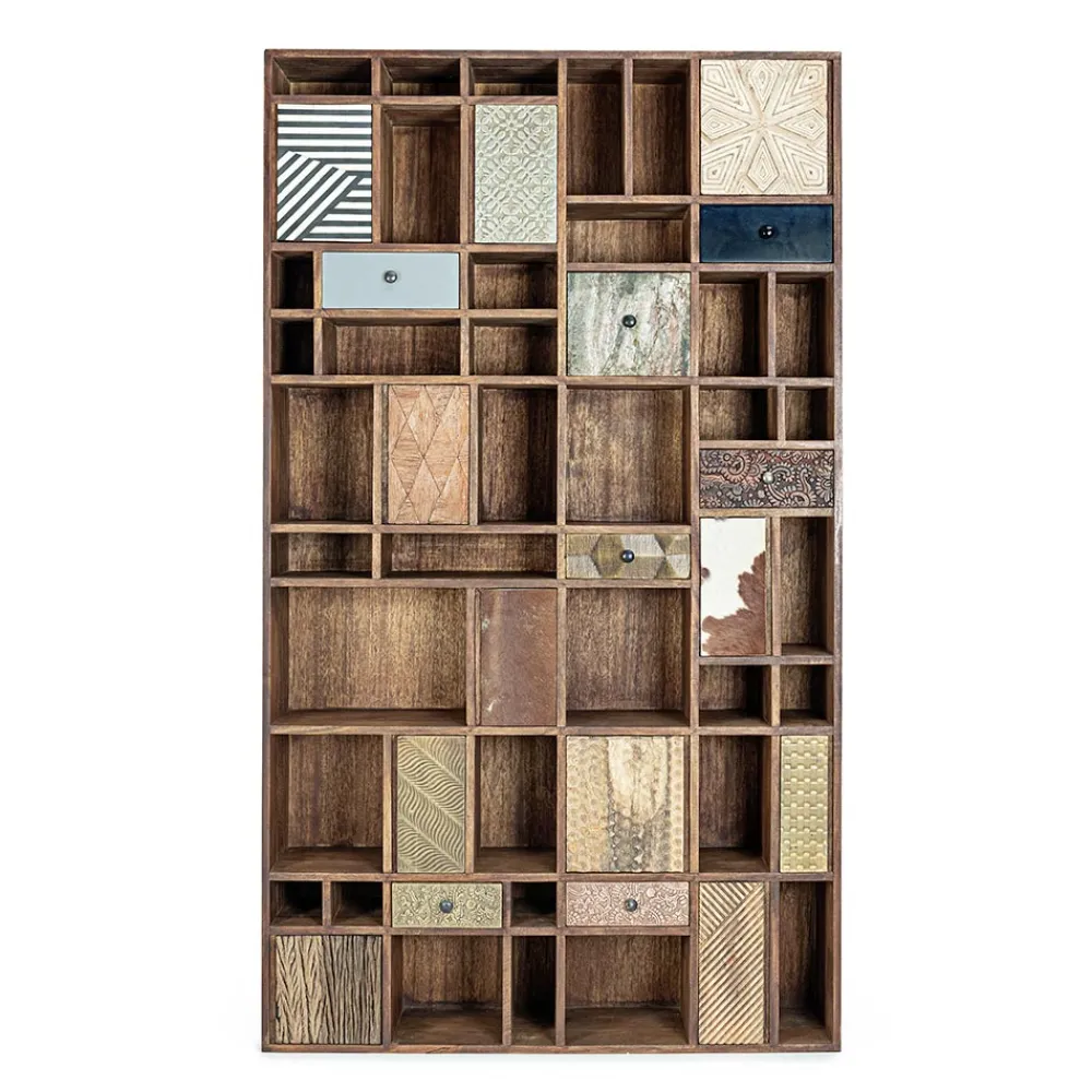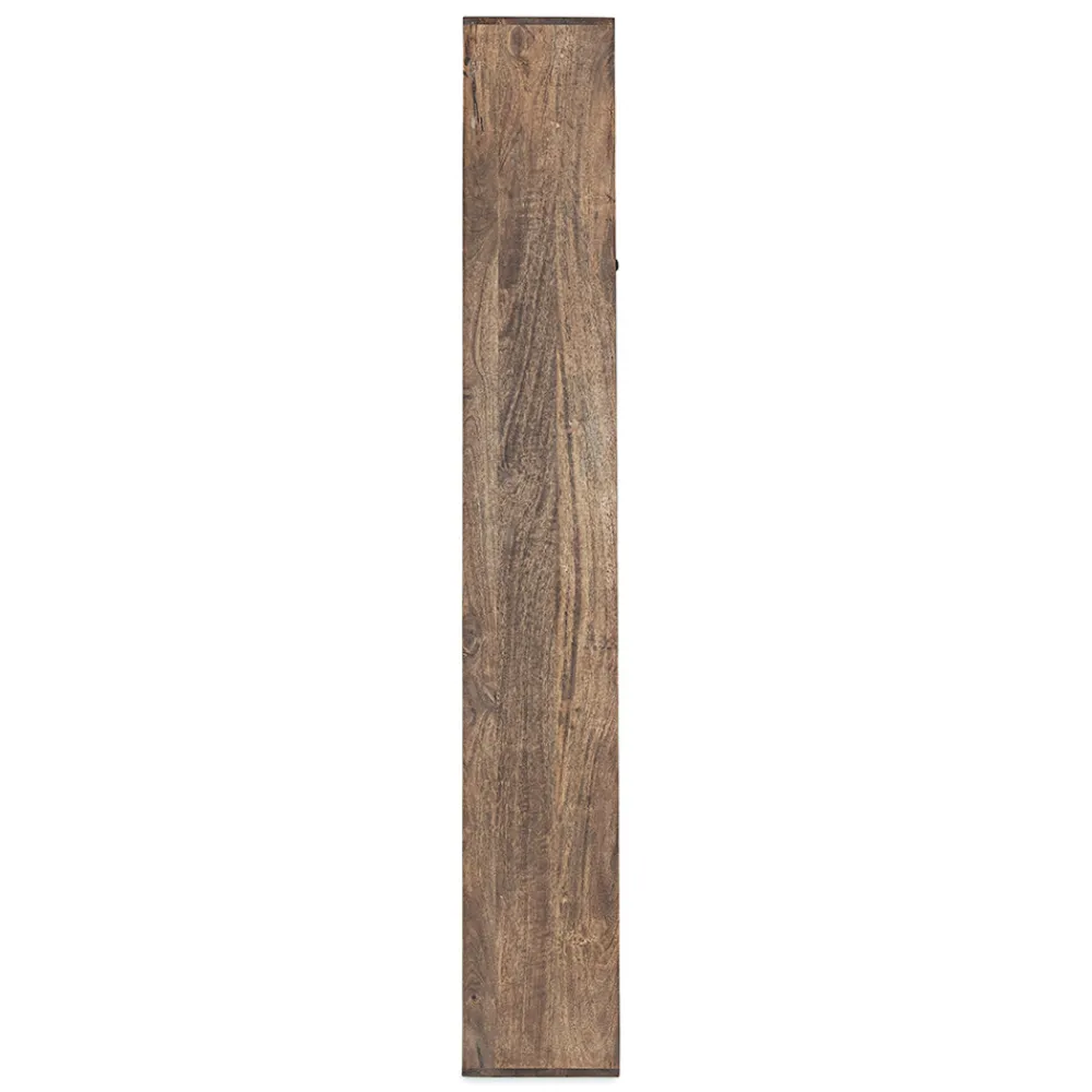 Dieses Bücherregal für das Wohnzimmer verfügt über eine Mangoholzstruktur mit MDF-Rückseite.