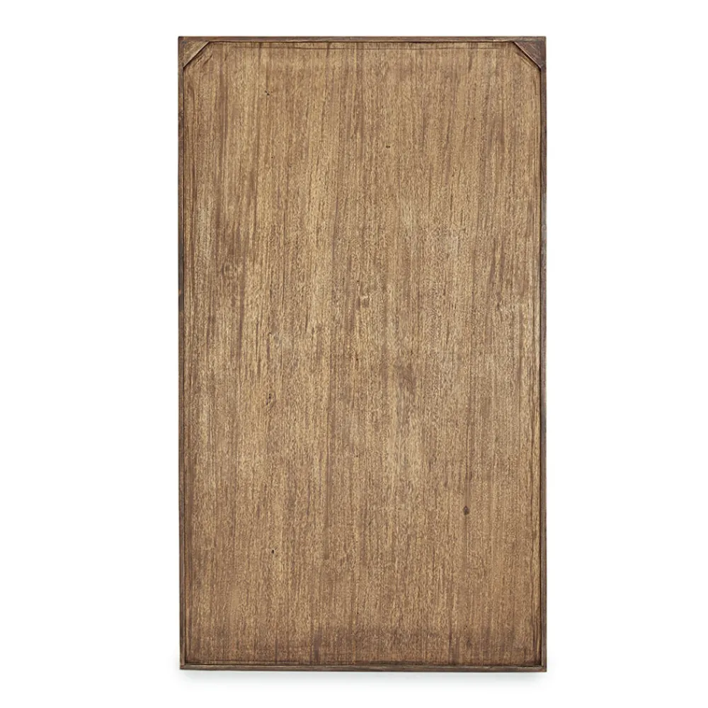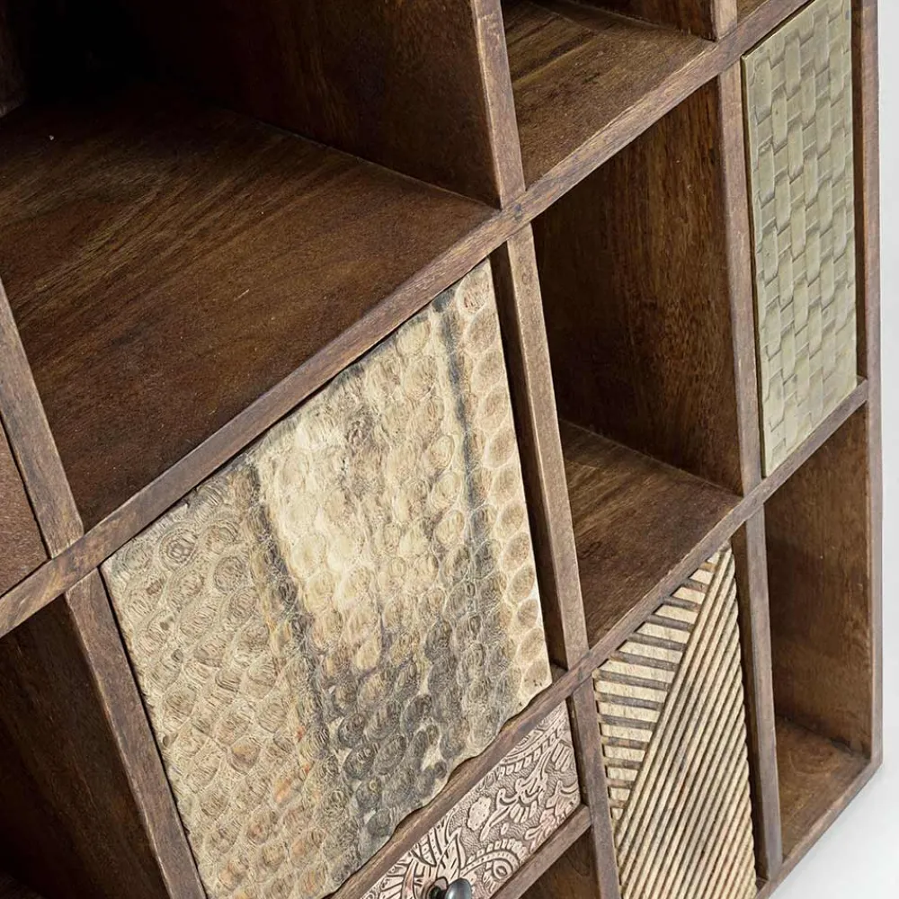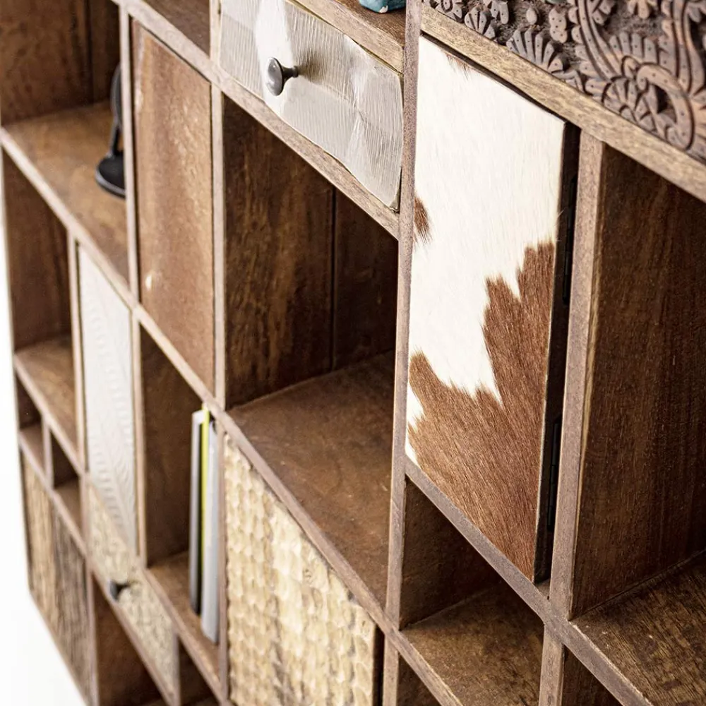 Die Front der Türen besteht aus recyceltem Mango- und Akazienholz mit Metall- und Lederapplikationen.