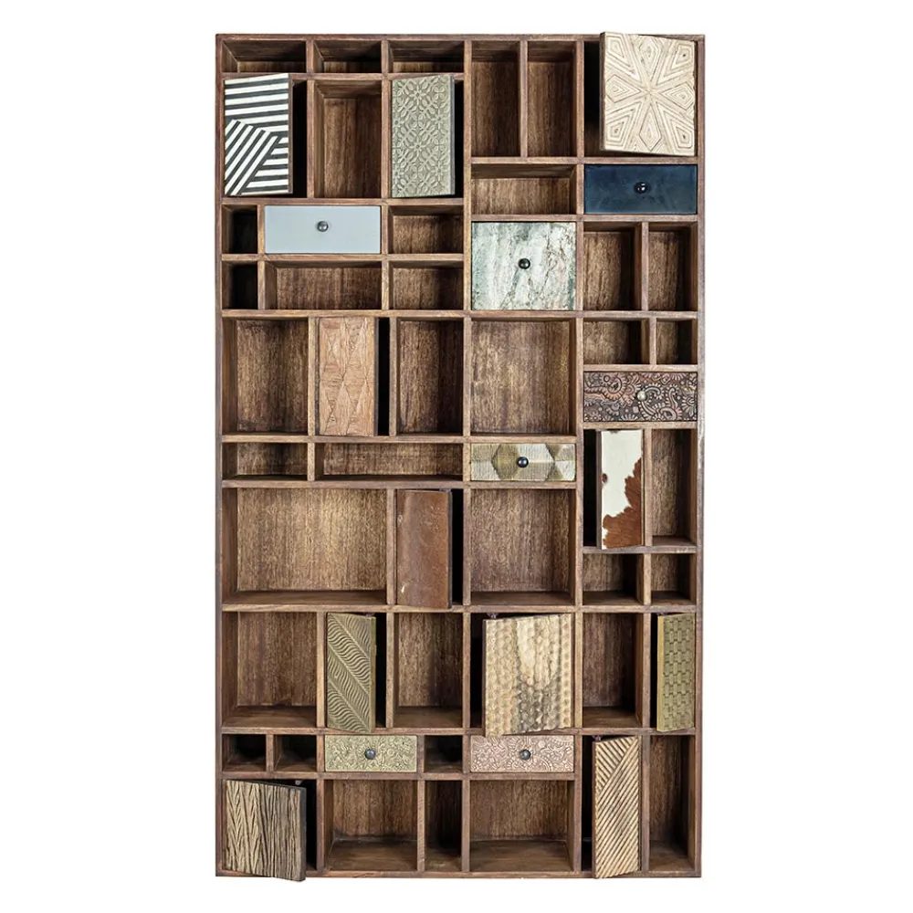 Bücherregal aus Mangoholz mit recycelten Türen und Stahlgriffen.