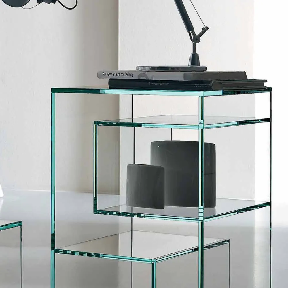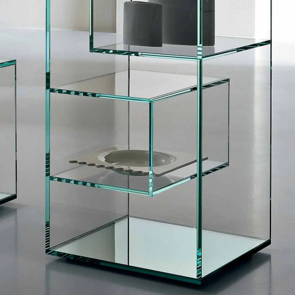 Niedriges freistehendes Wohnzimmer-Bücherregal aus extra klarem Glas, Luxus made in Italy.
