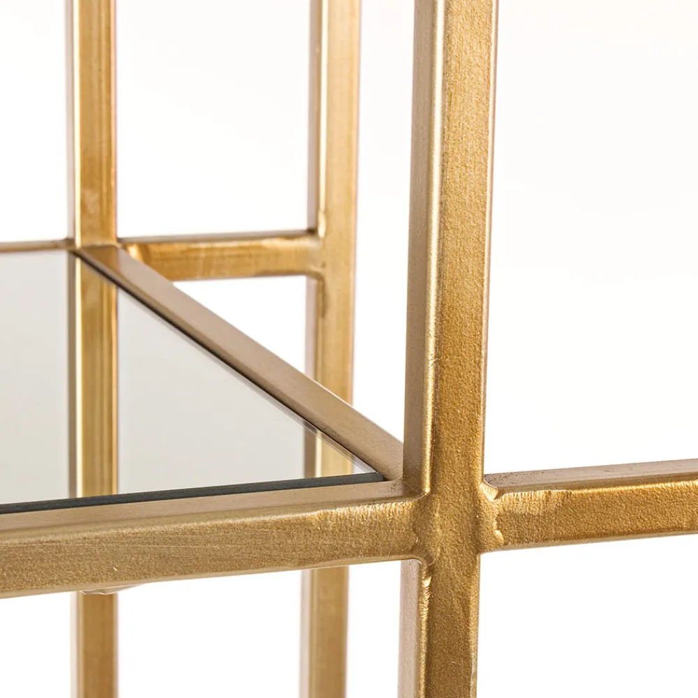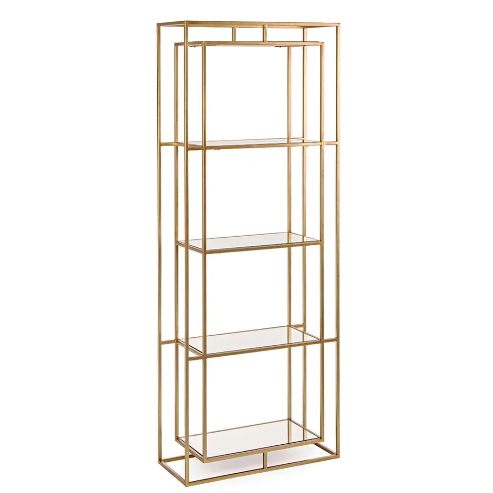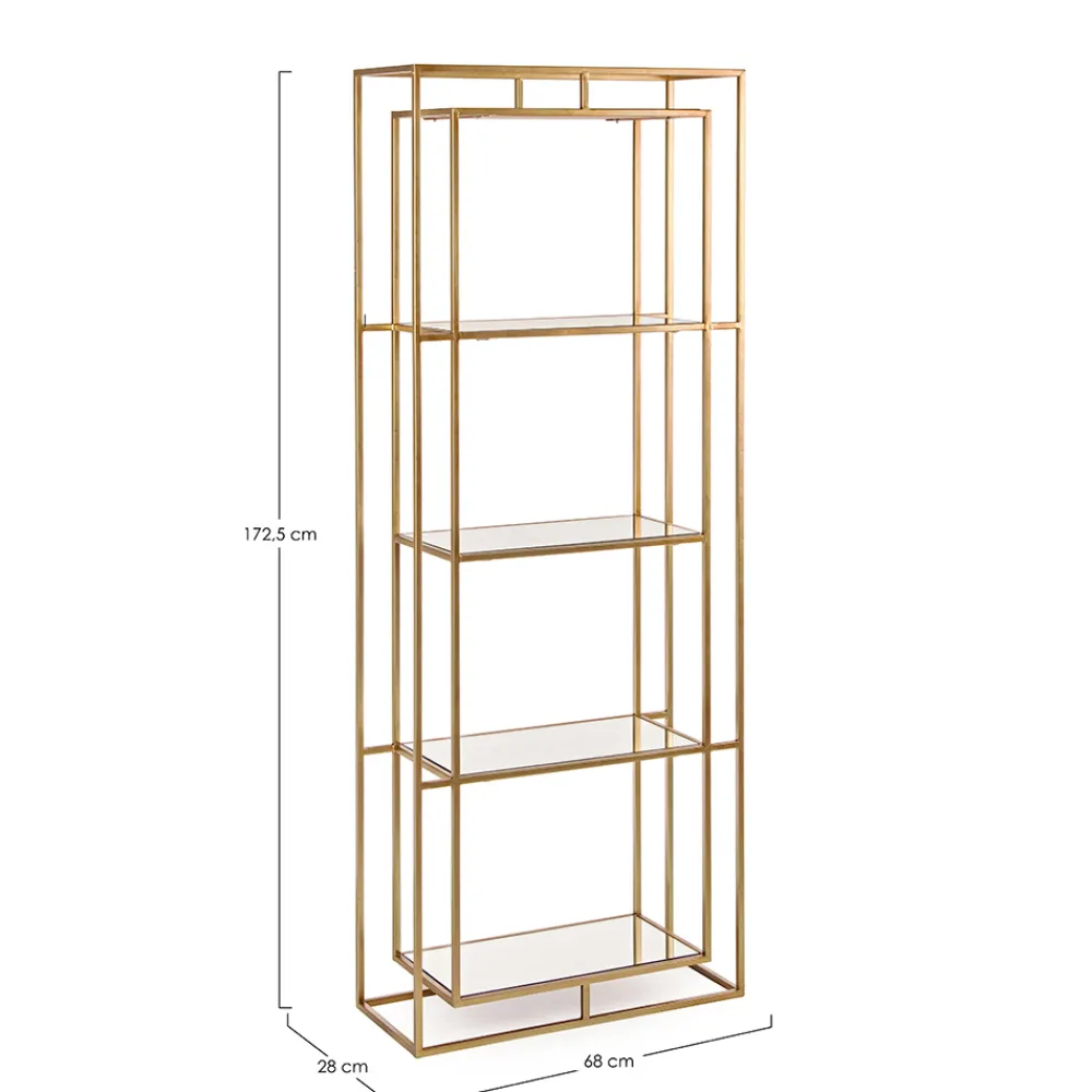 Dieses freistehende Bücherregal verfügt über eine epoxidpulverbeschichtete Stahlstruktur und Glasböden mit den Maßen 53,5 x 28 cm.