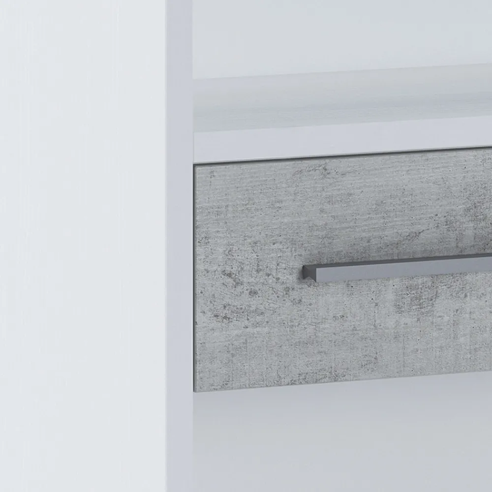 Bücherregal aus ökologischen Holzspanplatten mit offenporiger Melaminbeschichtung in Lärchenoptik und Schubladenfronten mit Melaminbeschichtung in Zementoptik.