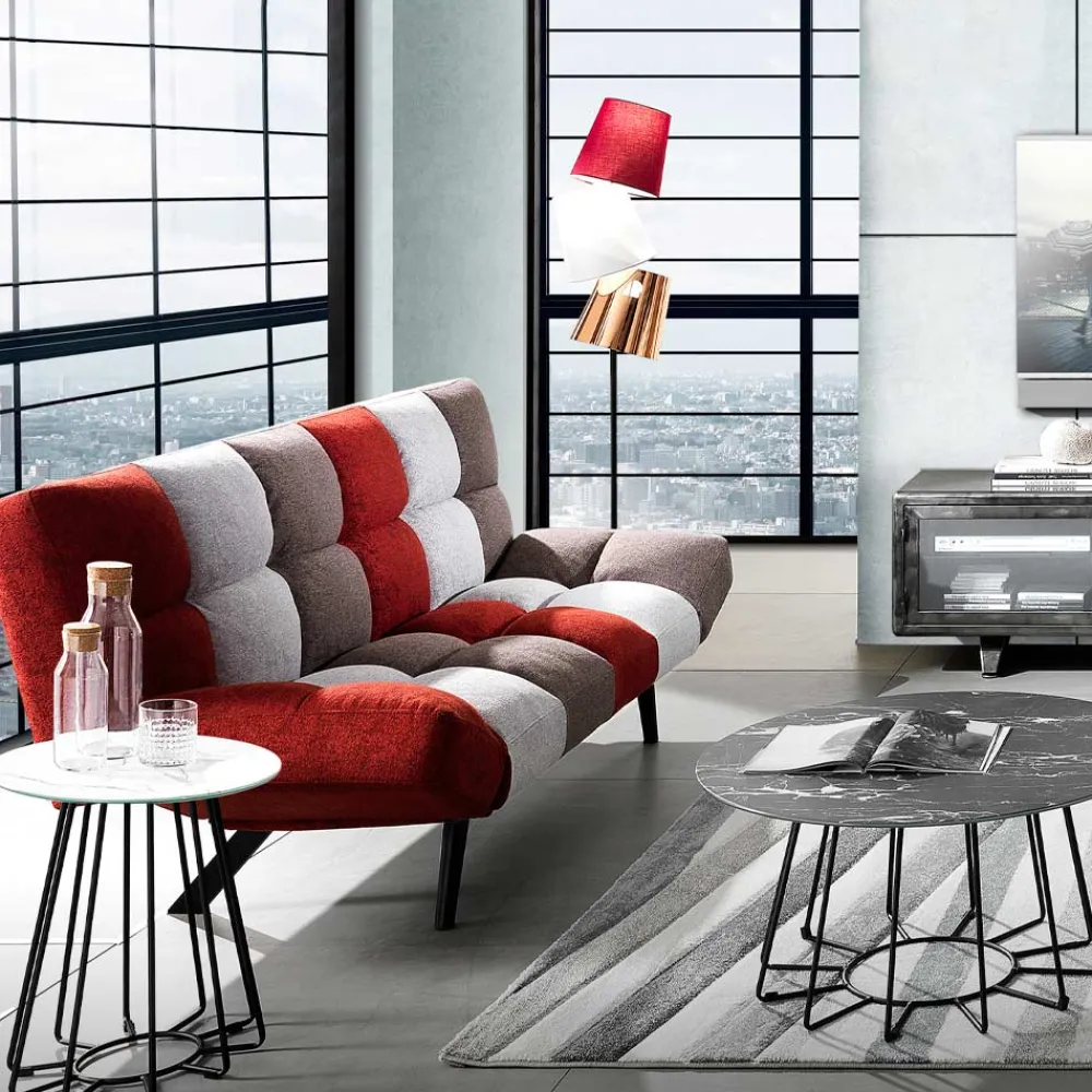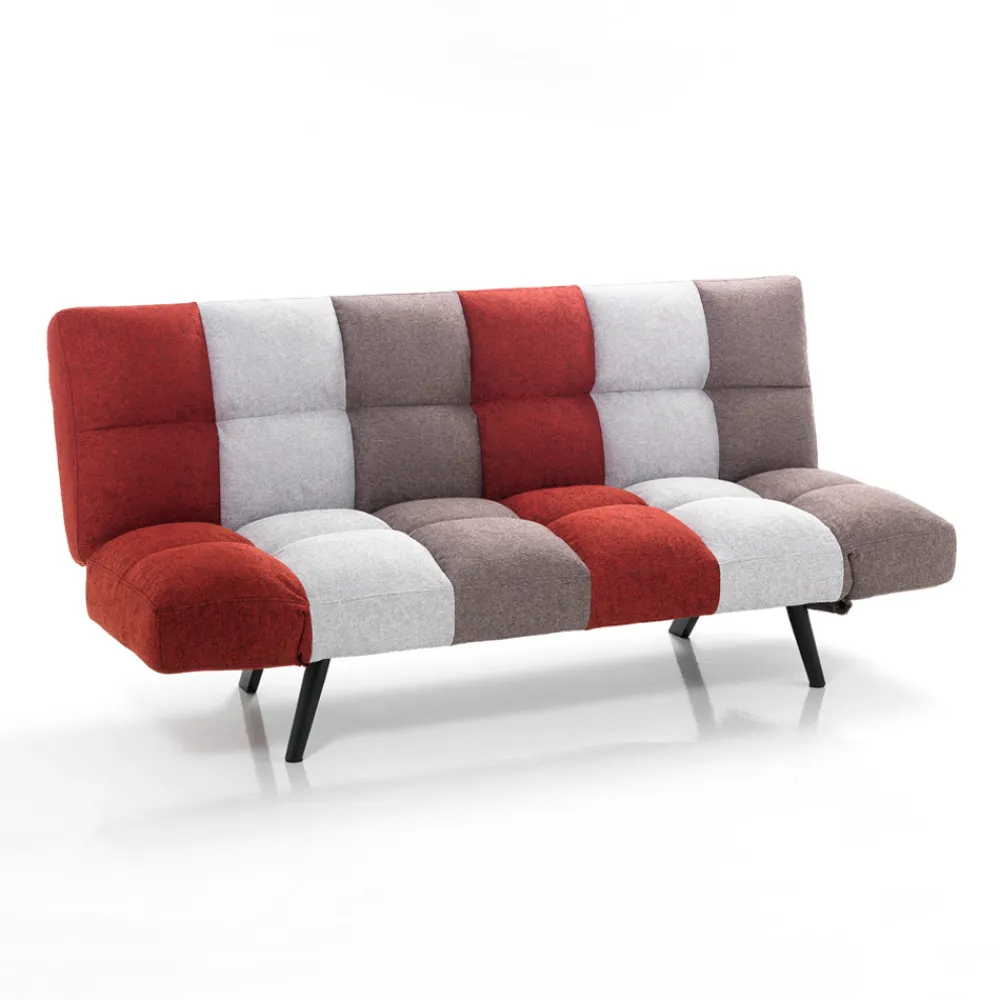 Sofa mit praktischem „Clic Clac“-Mechanismus zum Öffnen des Bettes, Sitzfläche mit nicht abnehmbarem mehrfarbigem Stoffbezug, Füße aus mattschwarz lackiertem Stahl, komplett aus .
