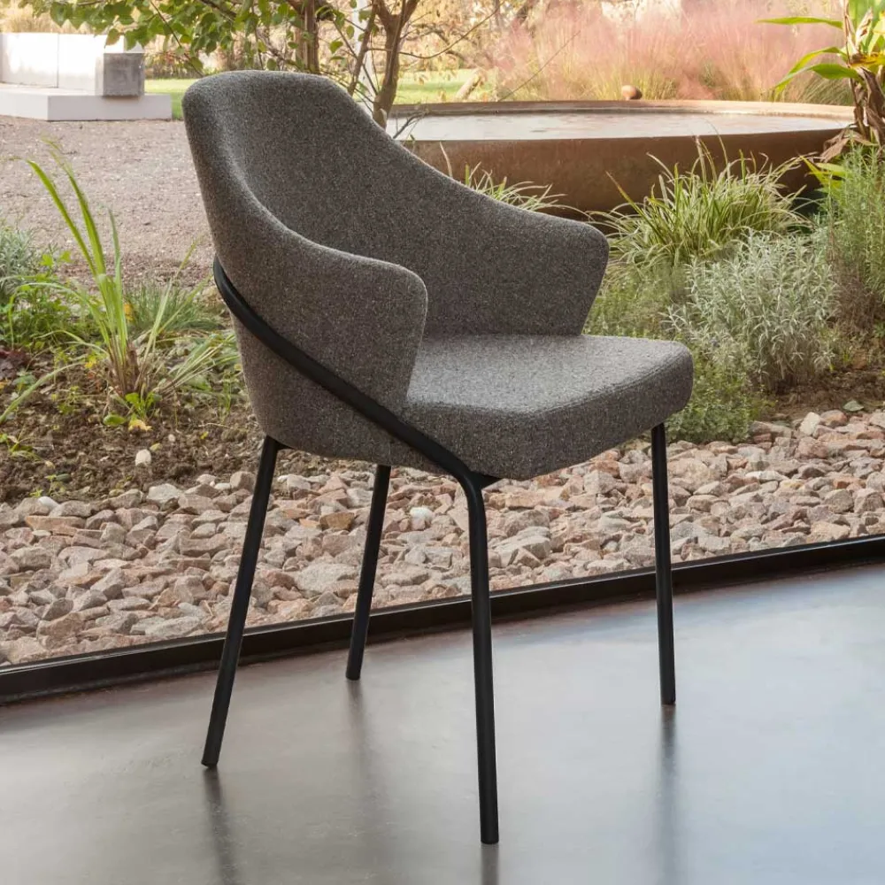 Sessel mit modernem Design, geprägt von weichen Linien, die Komfort und Vielseitigkeit garantieren. Er zeichnet sich durch einen in zahlreichen Farb- und Materialvarianten erhältlichen Bezug aus, der eine Anpassung an unterschiedliche Einrichtungsstile ermöglicht. Die pulverbeschichteten Metallbeine tragen einen gepolsterten Korpus mit passenden Nähten, die zum klaren und eleganten Design des Produkts beitragen. Diese Kollektion ist ideal für alle, die Einrichtungselemente mit modernem Design suchen, die nicht auf Komfort verzichten.