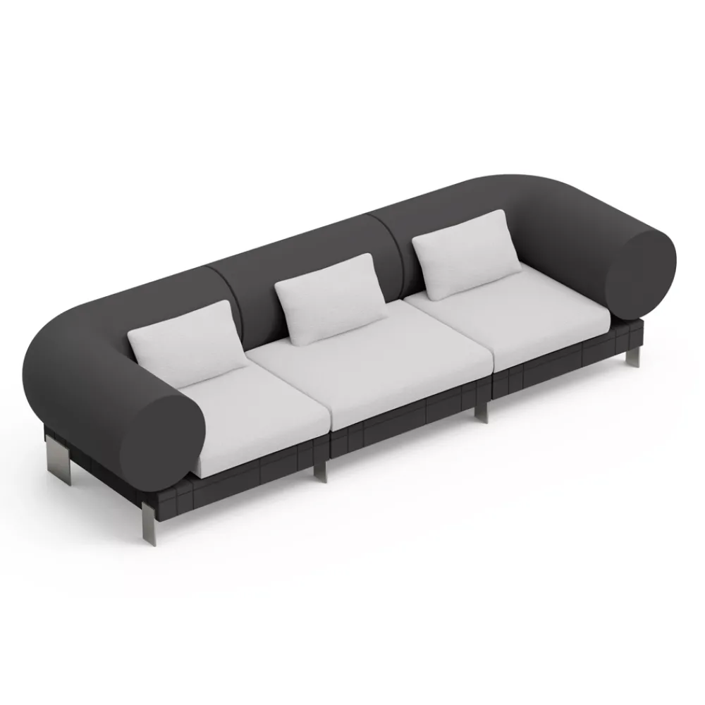 Sofa mit Polyethylenstruktur , Sitzkissen und 3 Rückenkissen aus Sunbrella-Stoff und Metallfüßen.
