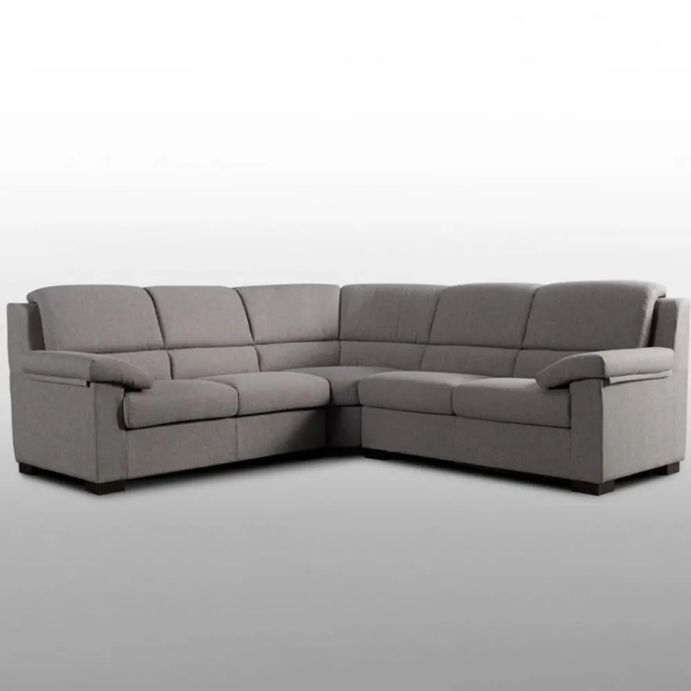 Vollständig in Italien hergestelltes 5-Sitzer-Wohnsofa mit hellgrauem Stoffbezug und Struktur aus Tannenholz und Spanplatten mit Polyurethanpolsterung. Die Sitz- und Rückenkissen hingegen haben eine Polsterung aus Polyurethanschaum mit Acrylfaser. Dieses Möbelstück besteht aus zwei Sofas, die durch eine runde Ecke verbunden sind.