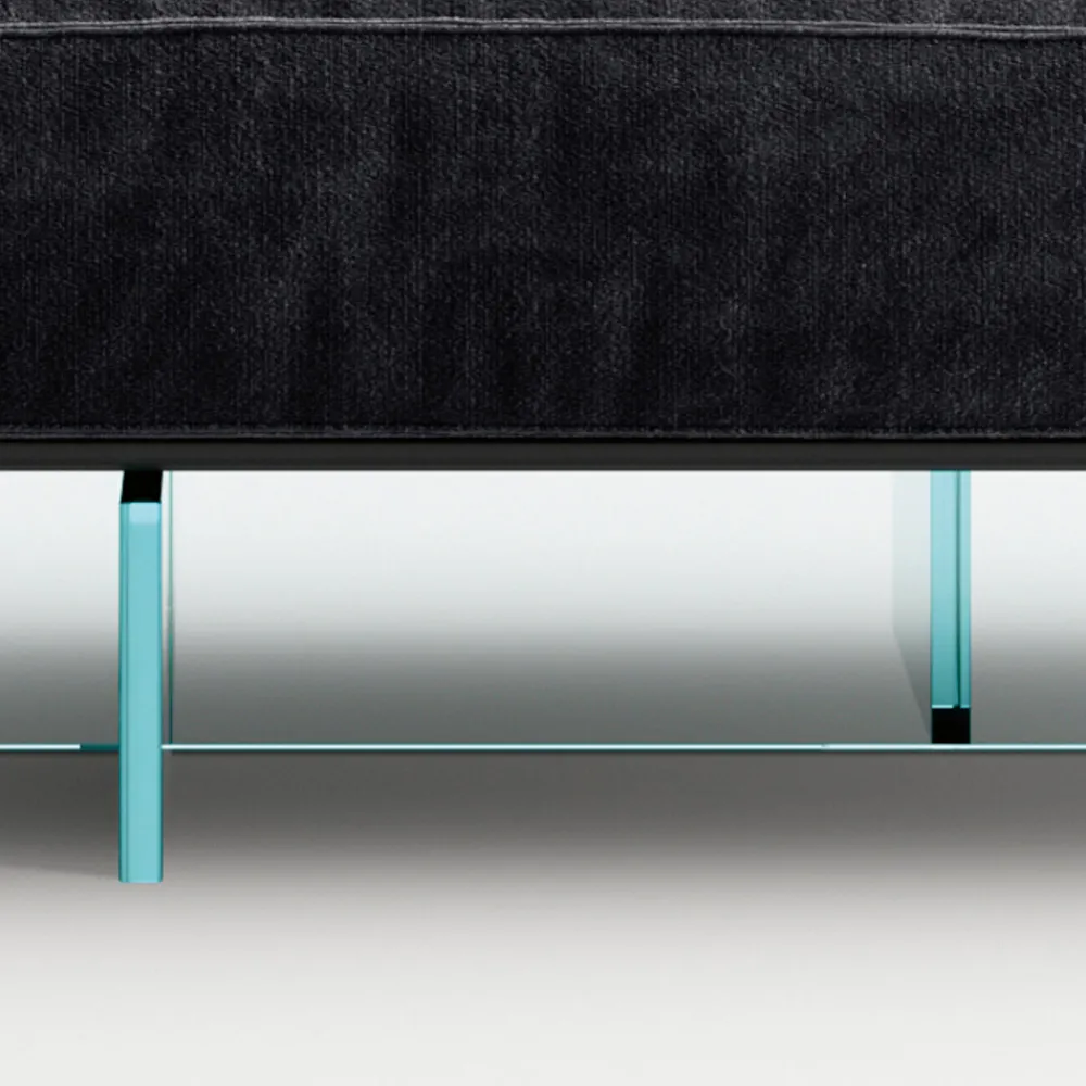2-Sitzer-Wohnzimmersofa mit Hocker , hergestellt mit einer tragenden Struktur aus Tischlerplatten auf Untergestellen aus extraklarem, 20 mm dickem, geschweißtem und laminiertem Glas . Sitz und Rückenlehne mit Polyurethanschaum unterschiedlicher Dichte gepolstert, mit Matratze aus Acrylfaserstapeln und mit schützendem Stoff bezogen. Der Außenbezug besteht aus abnehmbarem Stoff mit sichtbaren Doppelnähten.