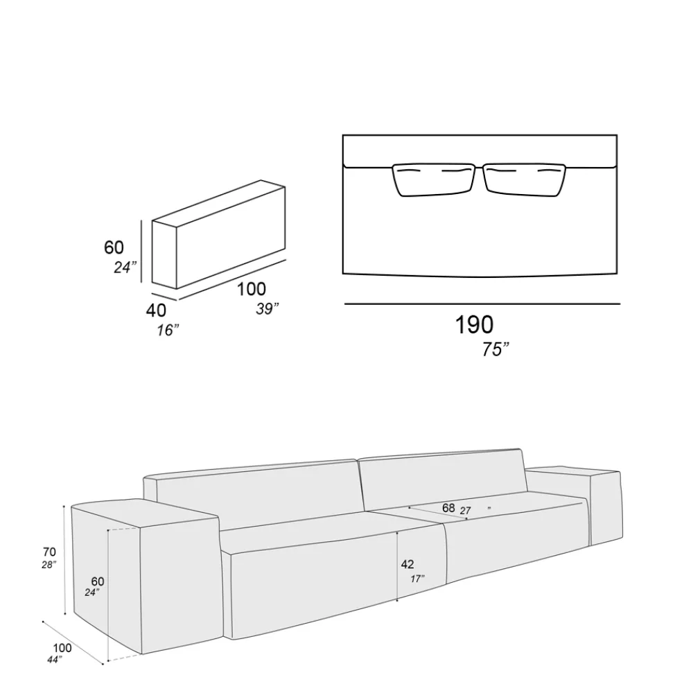- Sofa – Länge 190 x Tiefe: 100 x Höhe: 70 cm – Sitzhöhe: 42 cm