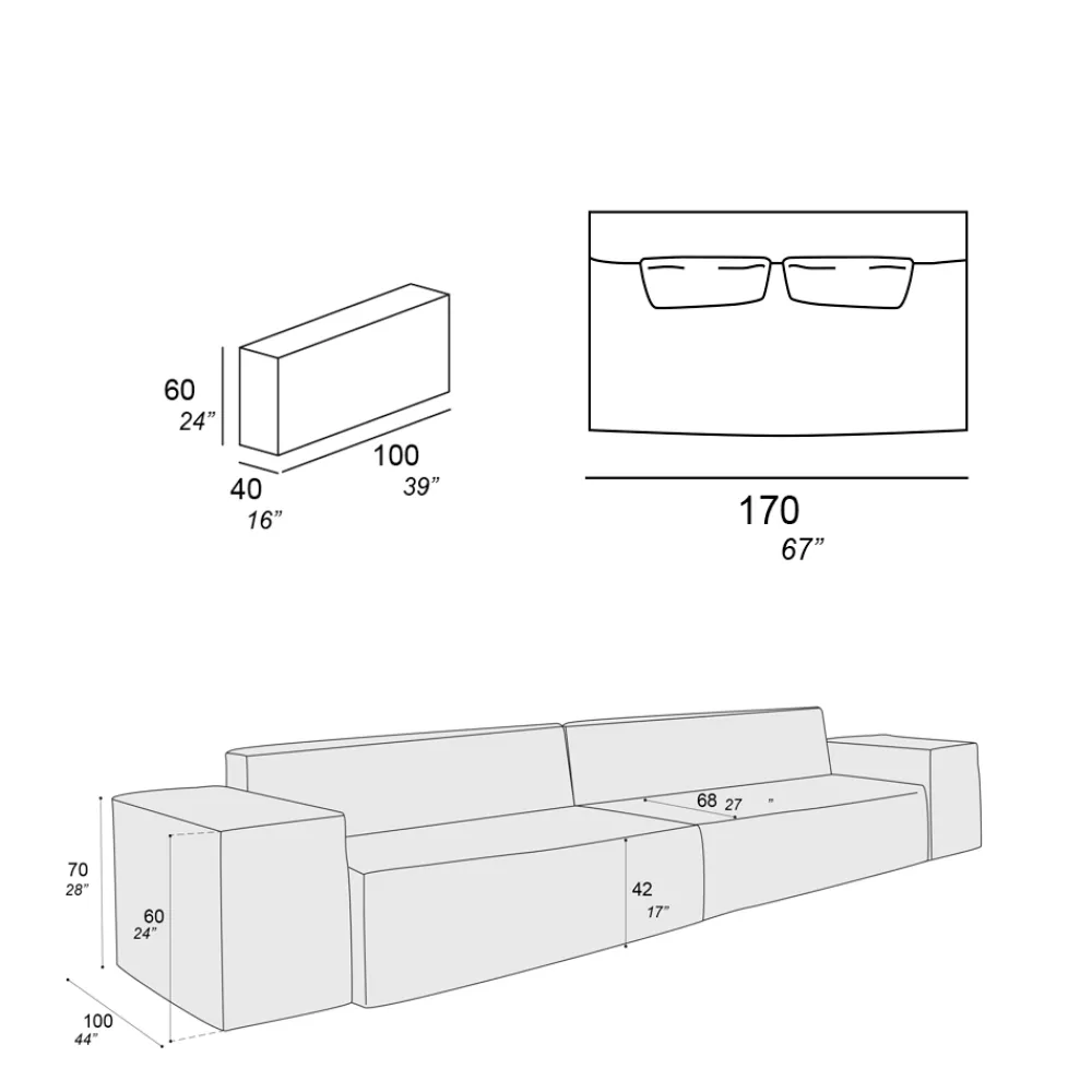 - Sofa – Länge 170 x Tiefe: 100 x Höhe: 70 cm – Sitzhöhe: 42 cm