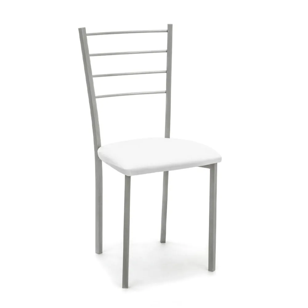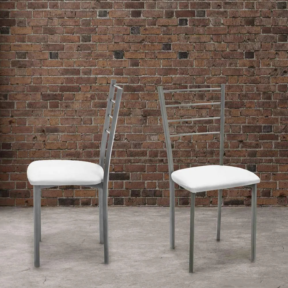 Satz von 4 Stühlen mit Sitz aus weißem Kunstleder , Gestell aus grau lackiertem Metall , komplett .