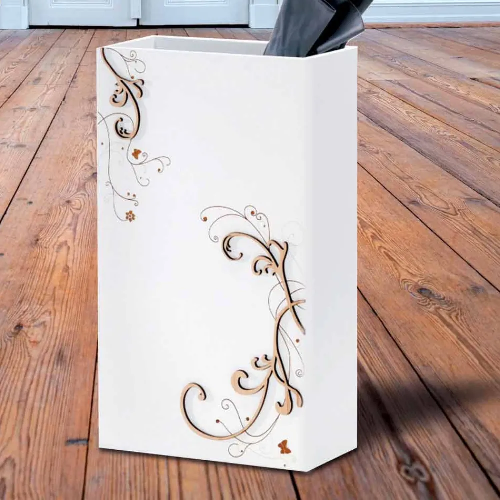 Eleganter und moderner rechteckiger Regenschirmständer aus Holz mit lasergeschnittenen Motiven, hergestellt in Italien.