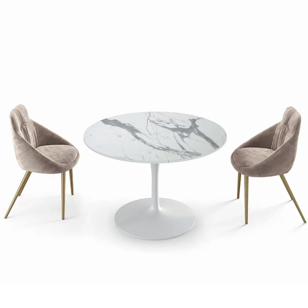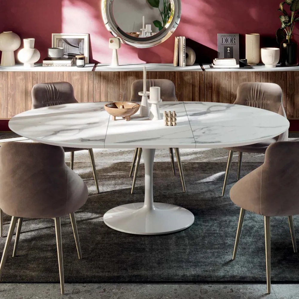 Ausziehbarer Wohnzimmertisch mit separaten Verlängerungen zum Einsetzen, Laminatplatte mit mattem Statuenfinish, 45° abgeschrägte Kante, Untergestell aus glänzend weiß lackiertem Aluminiumguss.