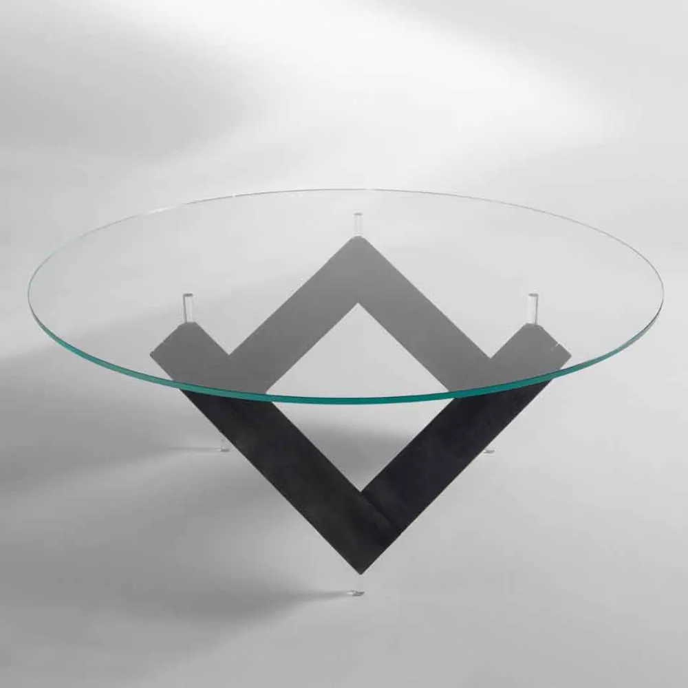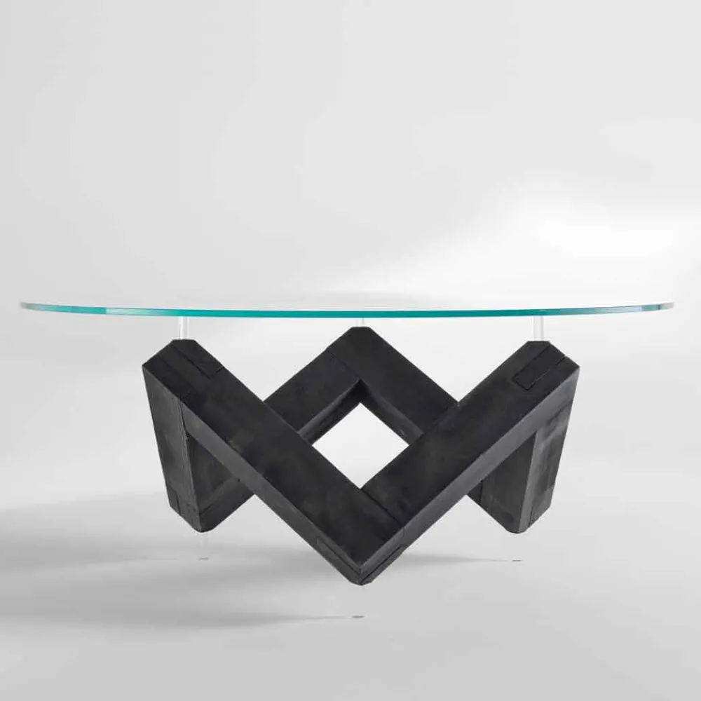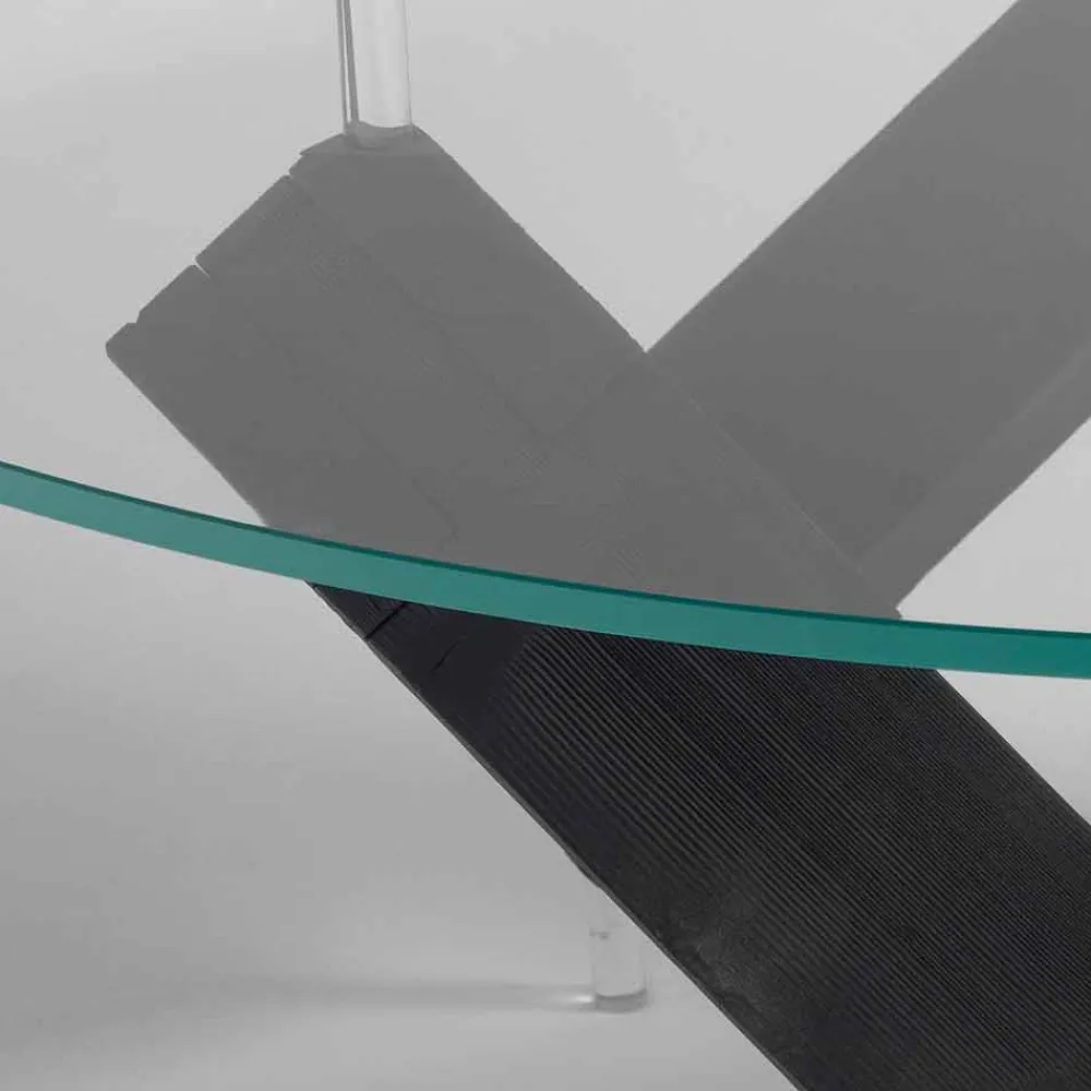 Designtisch mit Untergestell aus gebürstetem Eschenholz. Platte aus extraklarem, gehärtetem, transparentem Glas.