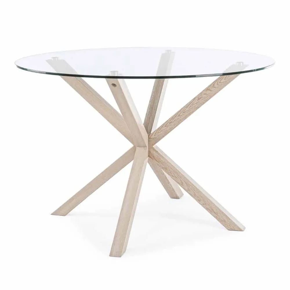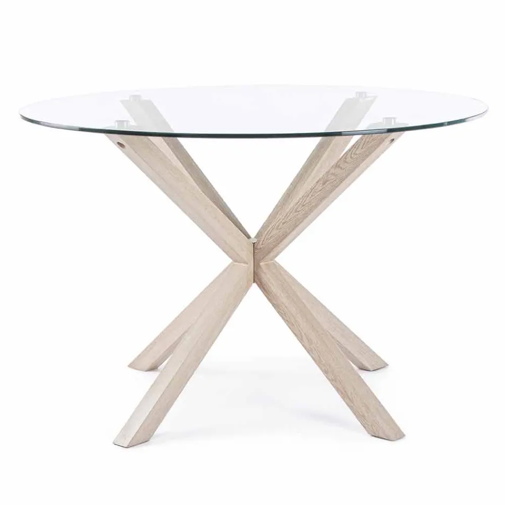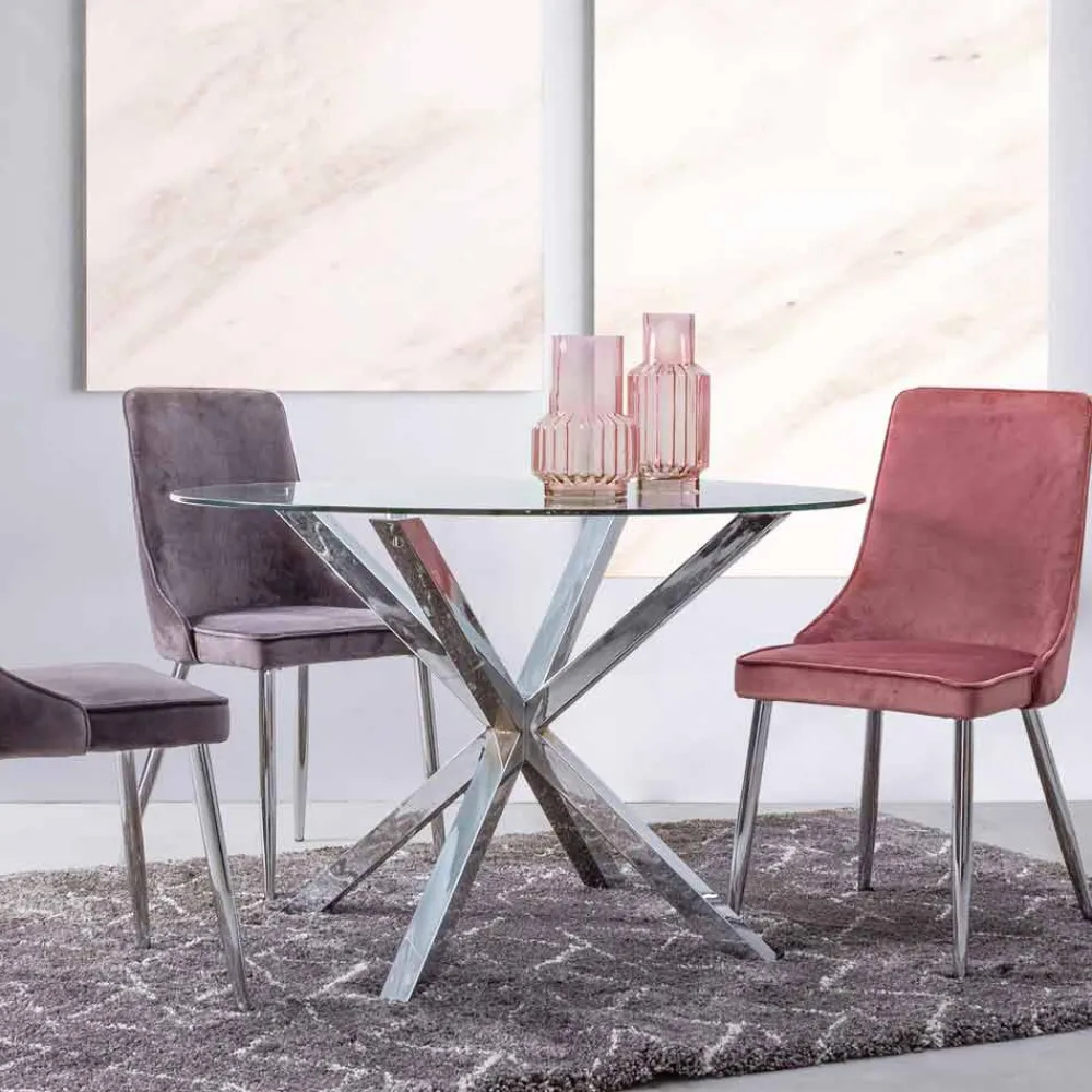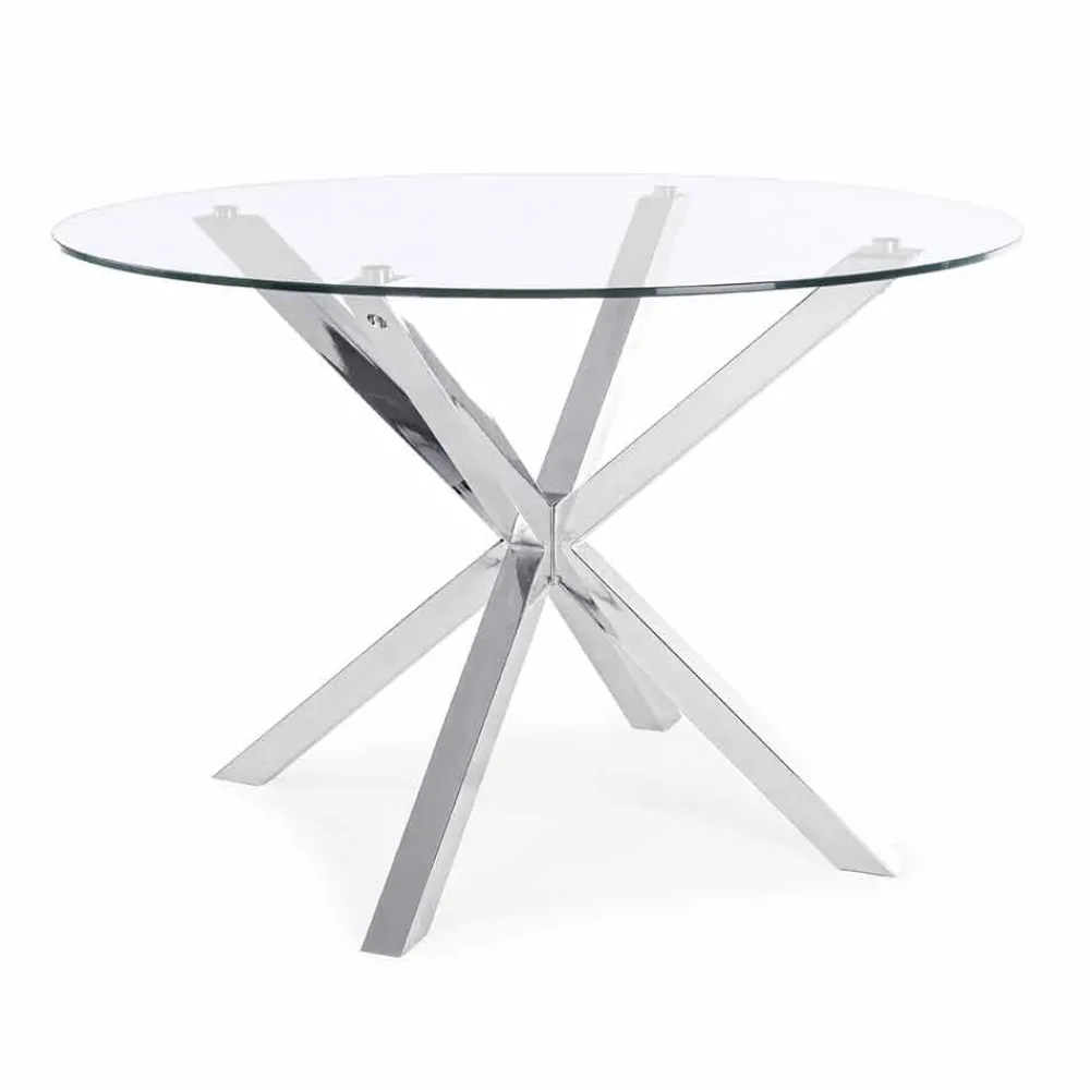 Moderner Esstisch mit runder Platte aus gehärtetem Glas.