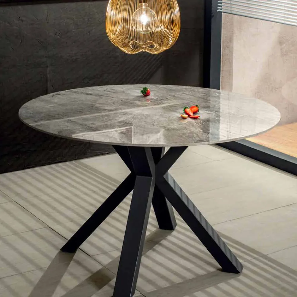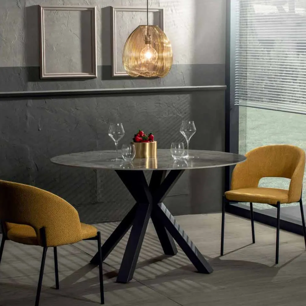 Dieser Esstisch ist ein äußerst elegantes Produkt, das perfekt zu Umgebungen passt, die durch moderne Möbel gekennzeichnet sind, die einen Hauch von Persönlichkeit und Charakter benötigen. Die Struktur besteht aus einer matten, anthrazitfarben lackierten Metallbasis und einer 1 cm dicken runden Oberseite aus massiver Keramik mit grauem Marmoreffekt. Diese besondere Art von Keramik hat die grundlegende Eigenschaft der Flexibilität , die es der Oberseite ermöglicht, robuster und widerstandsfähiger zu sein, wodurch Beschädigungen vermieden werden. Was diesen wunderbaren Tisch auszeichnet, ist zweifellos das besondere Design der Basis, das dank der geometrischen Spiele Bewegung gibt. Die Kombination von Materialien und Oberflächen in Kombination mit den minimalen und einfachen Linien von Ober- und Unterseite ermöglicht es, ein Endprodukt mit einem modernen und raffinierten Design zu erhalten, das sich ideal für die Einrichtung von Esszimmern oder Küchen mit elegantem Geschmack eignet, ohne den funktionalen Aspekt jemals zu vernachlässigen .