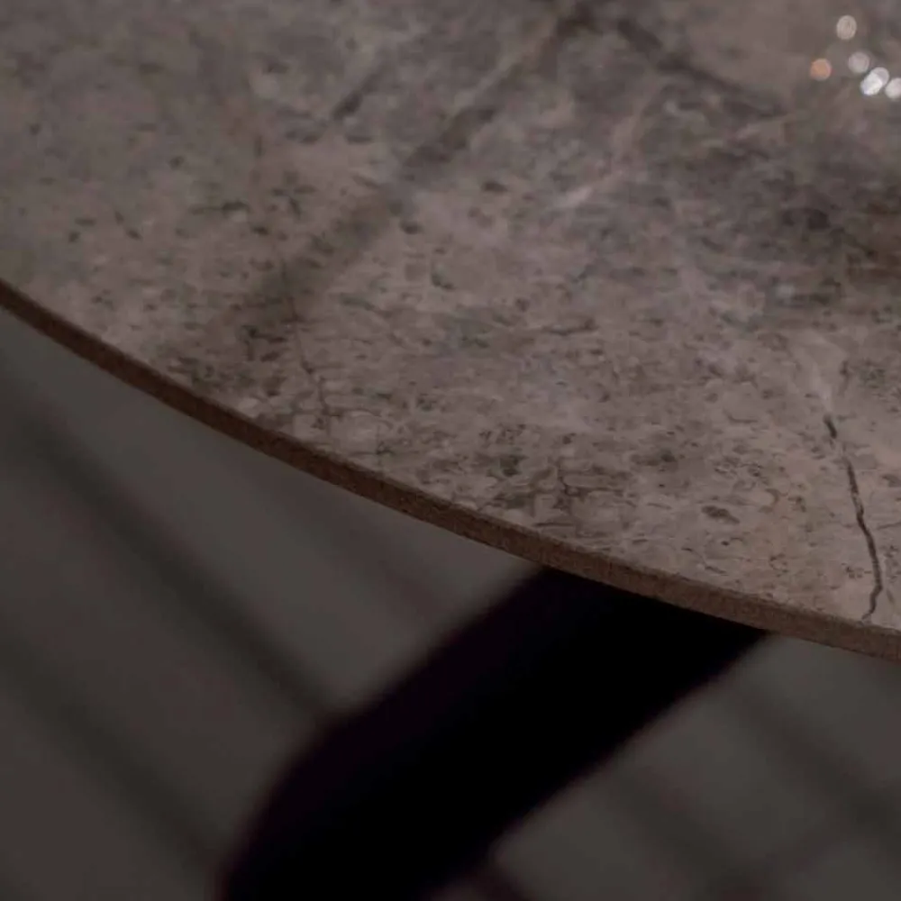 Runder Esstisch mit Keramikplatte und Metallfuß.