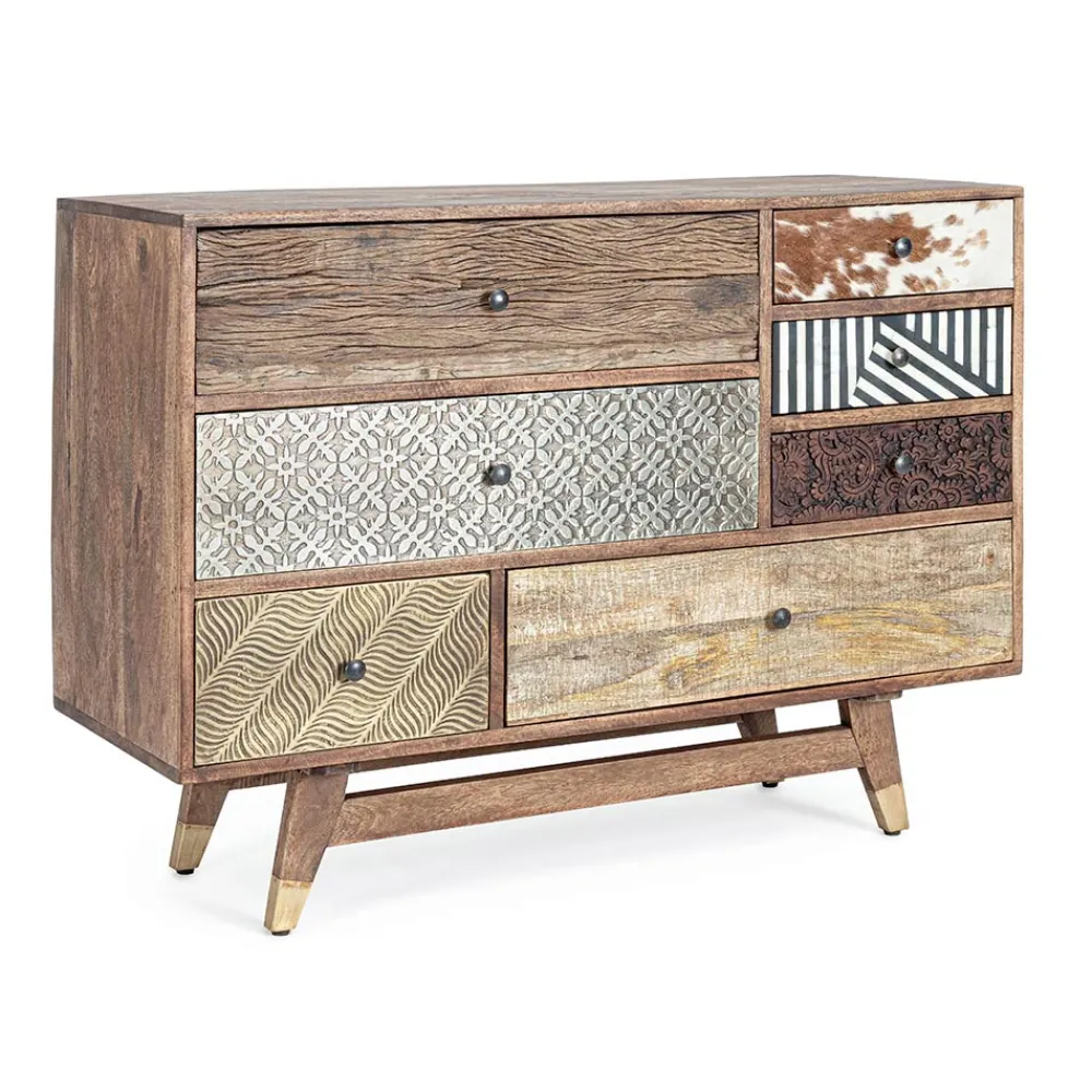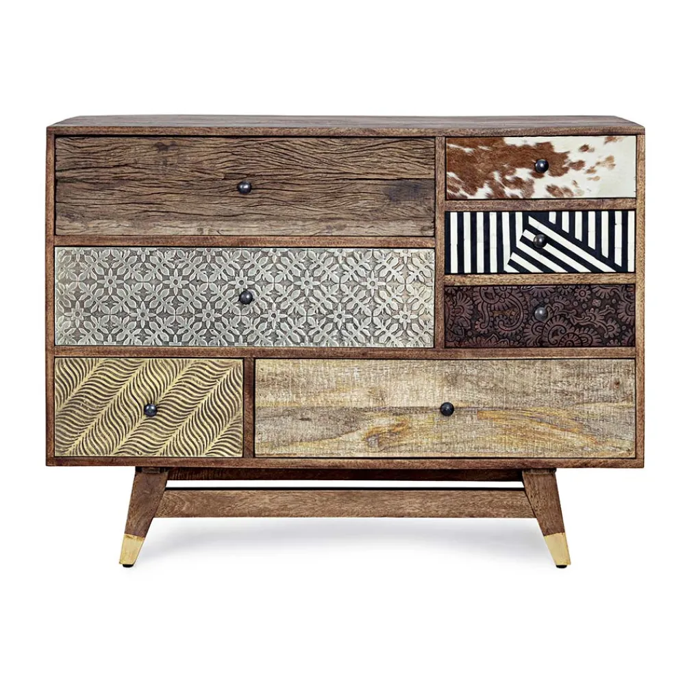 Die Besonderheit wird durch die Frontfläche der 7 Schubladen aus recyceltem Mango- und Akazienholz mit Applikationen in Metall und Leder mit wasserbasierter Lackierung gegeben.