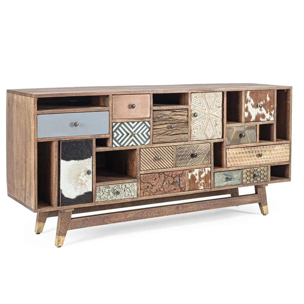 Die Besonderheit wird durch die Frontfläche der 2 Türen und Schubladen aus recyceltem Mango- und Akazienholz mit Applikationen in Metall und Leder mit wasserbasierter Lackierung gegeben. Beine zum Zusammenbauen.