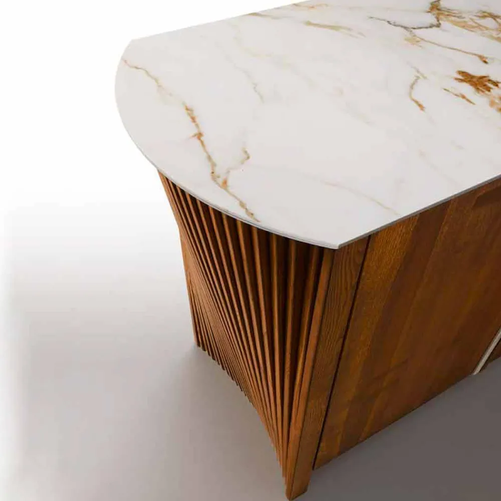 Sideboard mit Holzstruktur und Details aus Steinzeug mit Marmoreffekt, ein Luxusartikel Made in Italy.