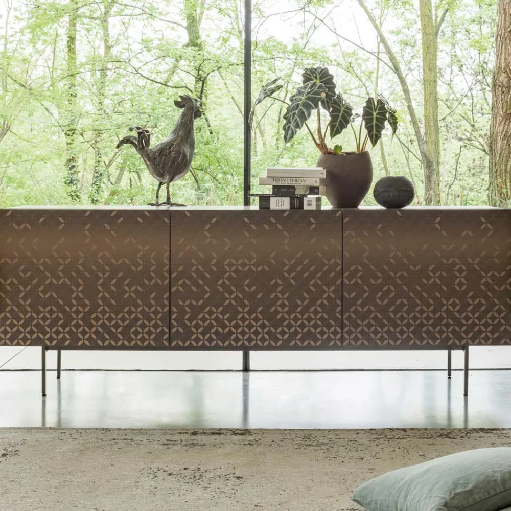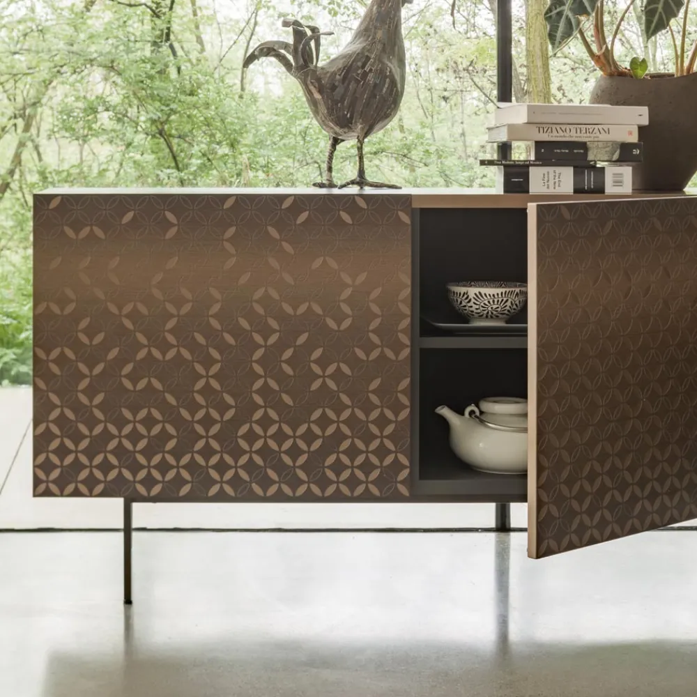 Eine Verschmelzung von Eleganz und Funktionalität, die die Schönheit moderner Umgebungen unterstreicht. Definiert durch die Dekoration der Türen, die das Möbelstück mit hochwertigen Details bereichern, die zarten Stickereien ähneln. Jedes Fach des Sideboards ist mit zwei geräumigen Innenregalen ausgestattet, die praktische Funktionalität gewährleisten. Die Wirkung der Eleganz wird durch den Einsatz betont, der die Türen kennzeichnet, ein Detail, das dem Design einen Hauch von Raffinesse und Modernität verleiht.