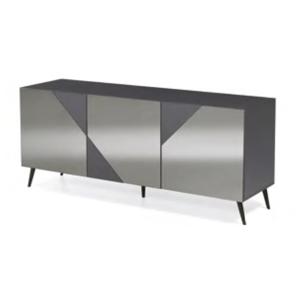 Wohnzimmer-Sideboard mit Struktur aus Melamin , 3 Türen aus MDF mit jeweils einem praktischen Regal im Inneren, bereichert durch elegante Glaseinsätze mit Spiegeleffekt und Sockel oder Füße aus schwarz lackiertem Metall . Dieses wunderbare dekorative und funktionelle Element für den Wohnbereich, das in einem Made in Italy- Produktionsprozess aus hochwertigen Rohstoffen hergestellt wird, zeichnet sich durch ein einfaches und essentielles Design aus, das durch das beispiellose Spiel von Linien und geometrischen Formen bereichert wird, das sich an den drei Türen entwickelt.