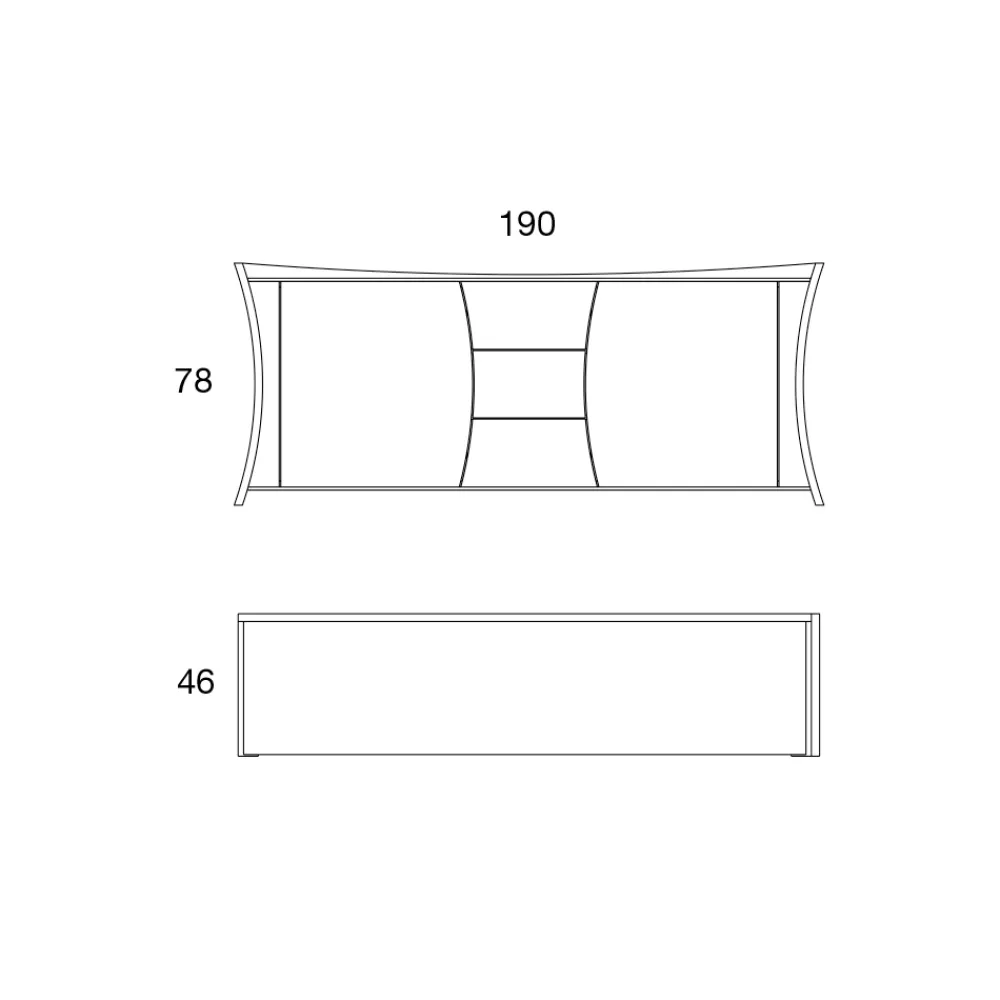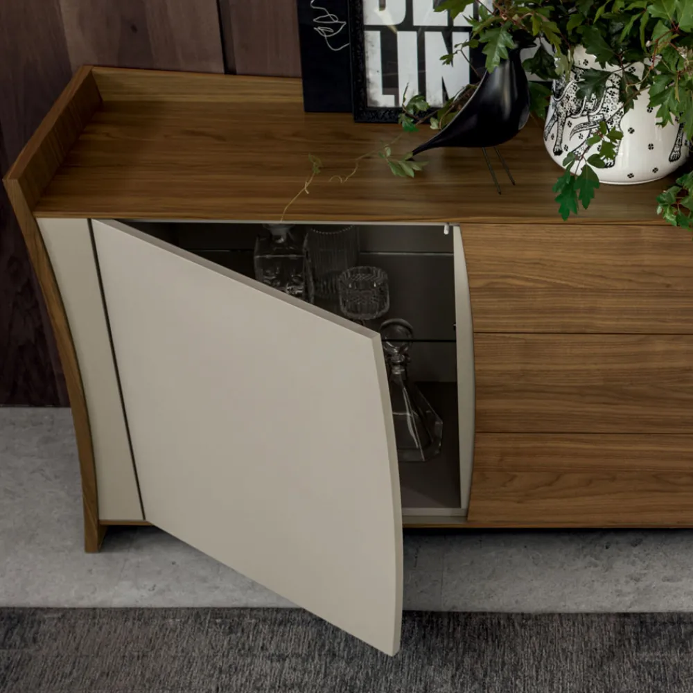 Sideboard aus furniertem und lackiertem Holz mit Türen und Schubladen, geschwungenes Design, hergestellt in Italien.