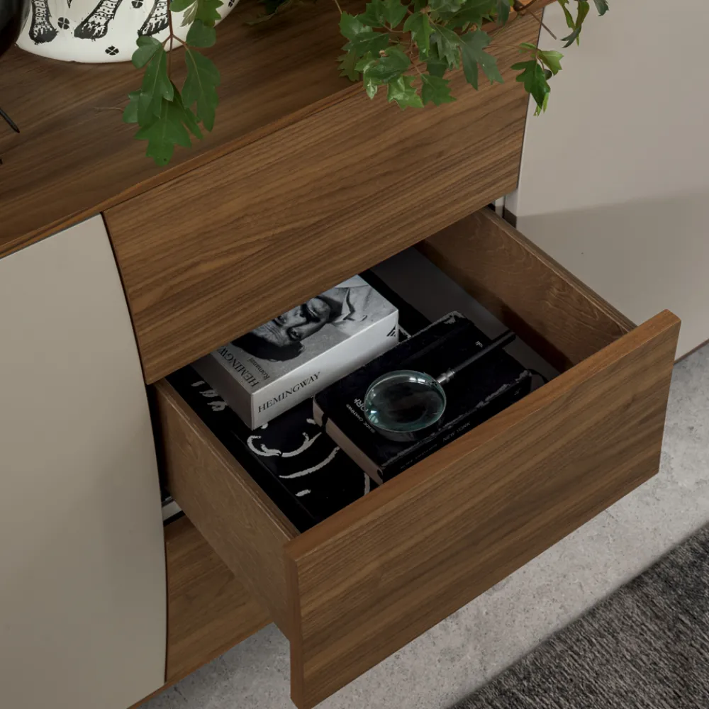 Dieses Sideboard für das Wohnzimmer verfügt über eine Struktur, die vollständig aus Holzfurnier in der Ausführung „Canaletto-Walnuss“ besteht, das zart über die Oberseite hinausragt und diese mit einer geformten Rückwand einrahmt.