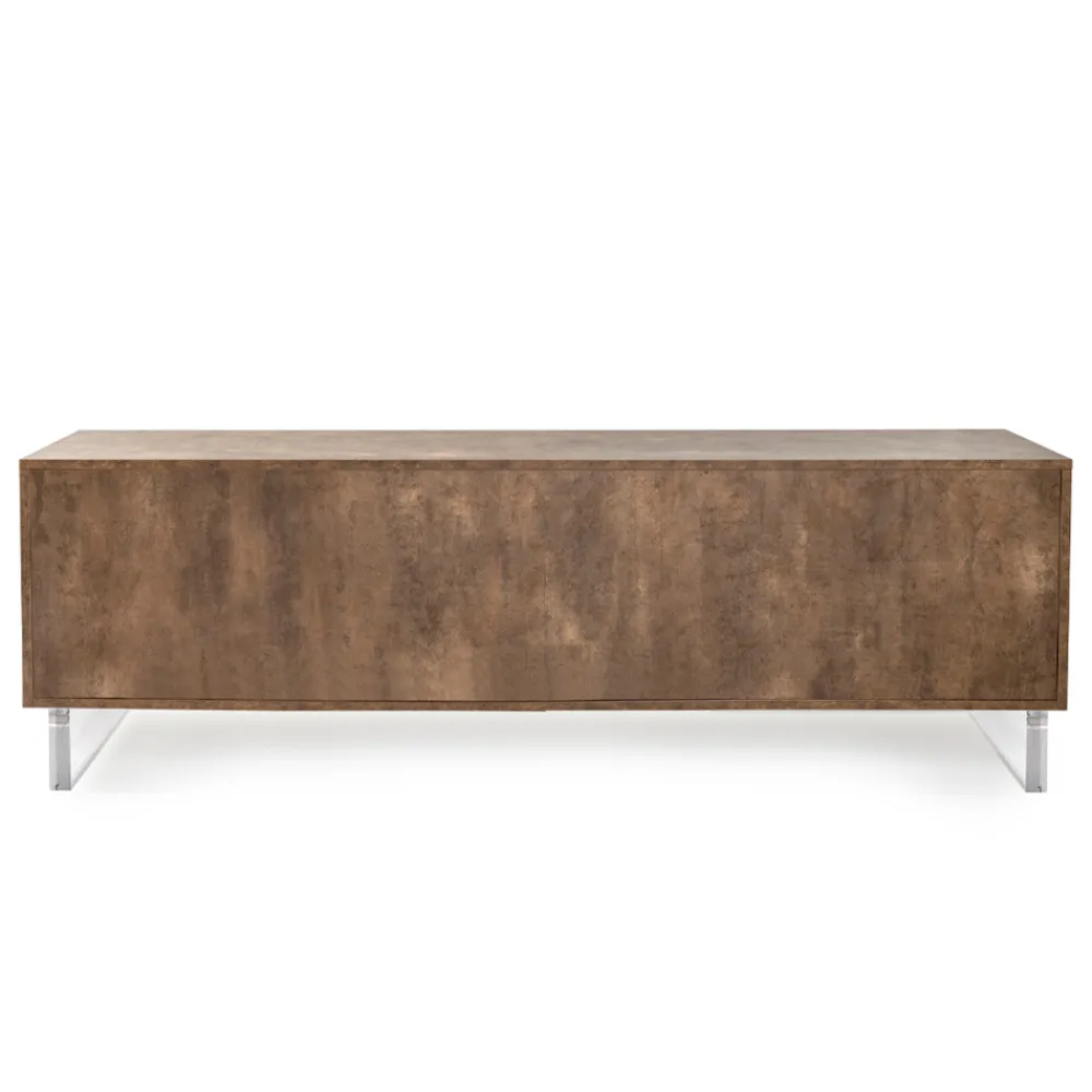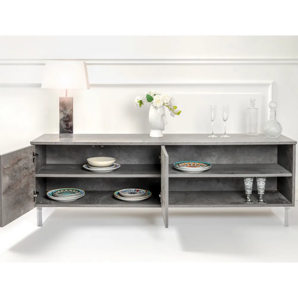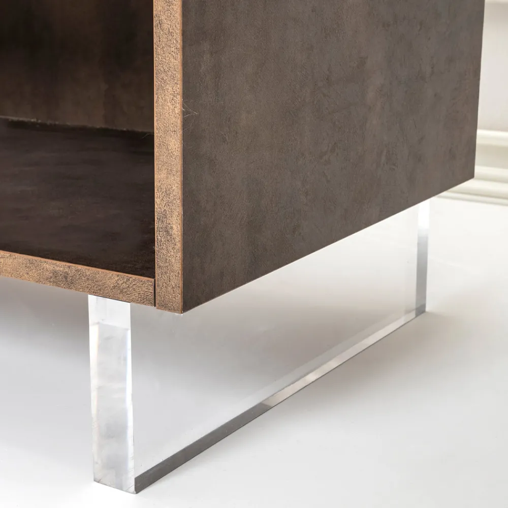 Mit seinen Plexiglasfüßen scheint das Sideboard den Boden zu berühren, ein Designdetail, das einen Hauch von Modernität und Leichtigkeit verleiht. Im Inneren warten ordentliche Regale darauf, alles aufzubewahren, was Sie lieben, von Büchern bis hin zu Alltagsgegenständen, und bieten eine elegante Lösung für Ihr Organisationsbedürfnis.