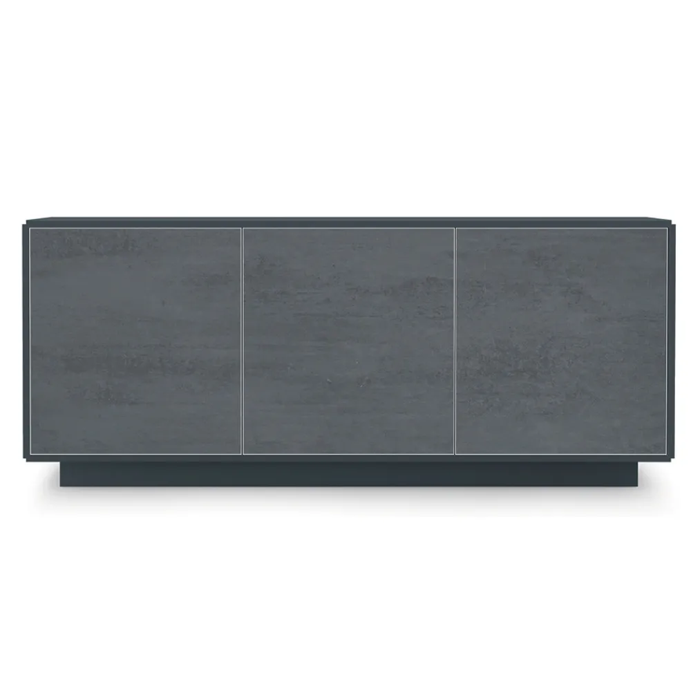 Modernes Sideboard mit Sockelstruktur und Sockel aus lackiertem Holz mit mattem Schiefergrau-Finish, 2 oder 3 Türen mit Aluminiumprofil und Fronten aus HPL-Laminat in Steinoptik, ausgestattet mit Push&Pull-Öffnungssystem und Innenregalen aus transparentem Hartglas (Stärke 6 mm, maximale Tragfähigkeit 20 kg). Dieses zu 100 % in Italien hergestellte Einrichtungsaccessoire aus hochwertigen Materialien stellt die perfekte Kombination aus Funktionalität und Design dar und sorgt für ein Ergebnis mit moderner Persönlichkeit und starker szenografischer Wirkung , ideal für diejenigen, die einen raffinierten und eleganten Einrichtungsstil lieben. Avantgarde . Um seinen Wert noch mehr zu unterstreichen, ist die HPL-Oberseite ein Hochdrucklaminat , das äußerst beständig gegen Chemikalien, Abrieb und Kratzer ist und es uns ermöglicht, eine solide Trägeroberfläche mit ausgezeichneter Haltbarkeit im Laufe der Zeit anzubieten.