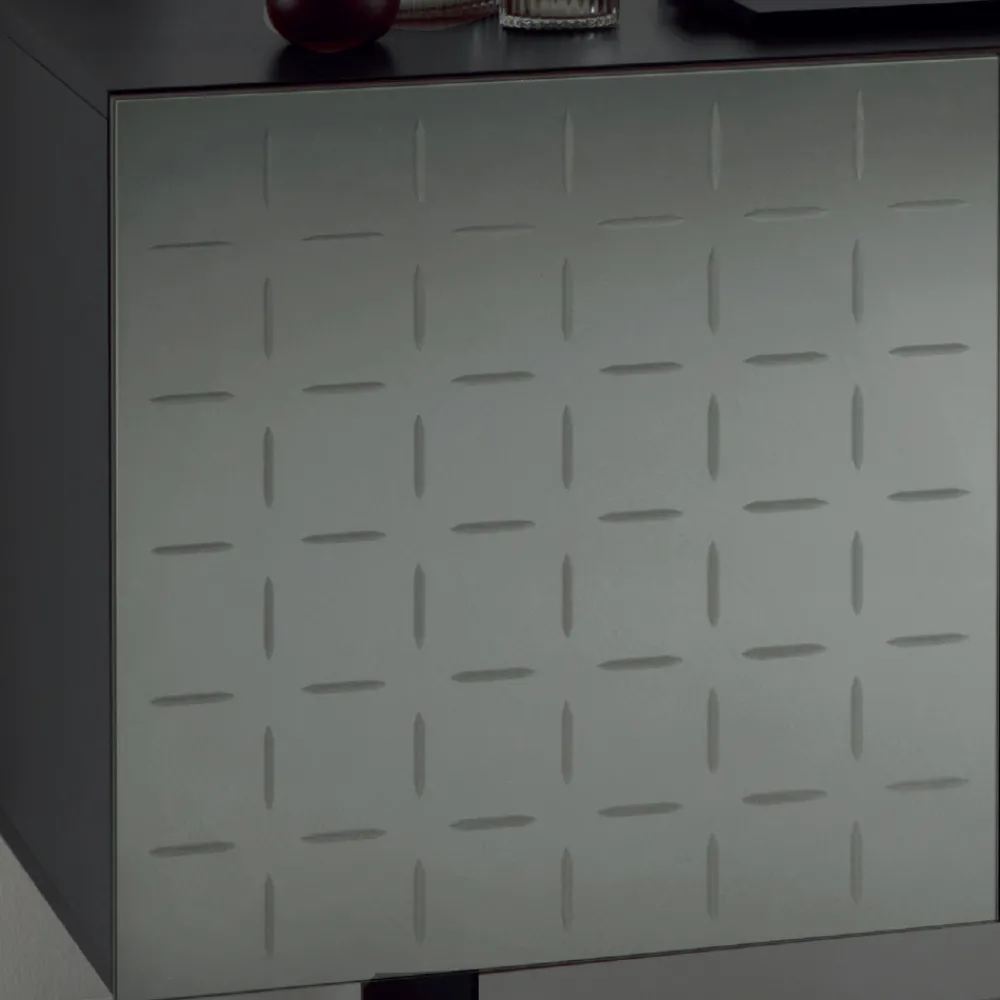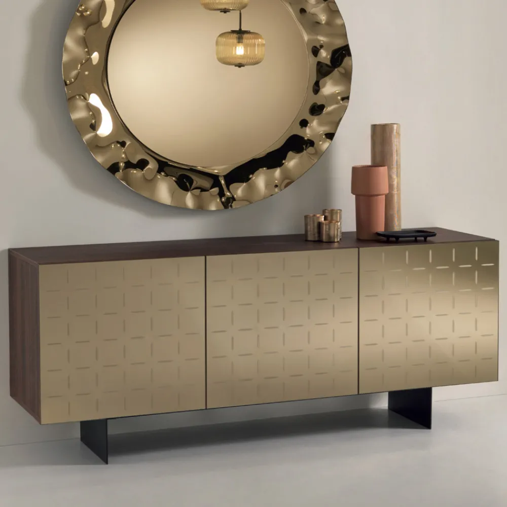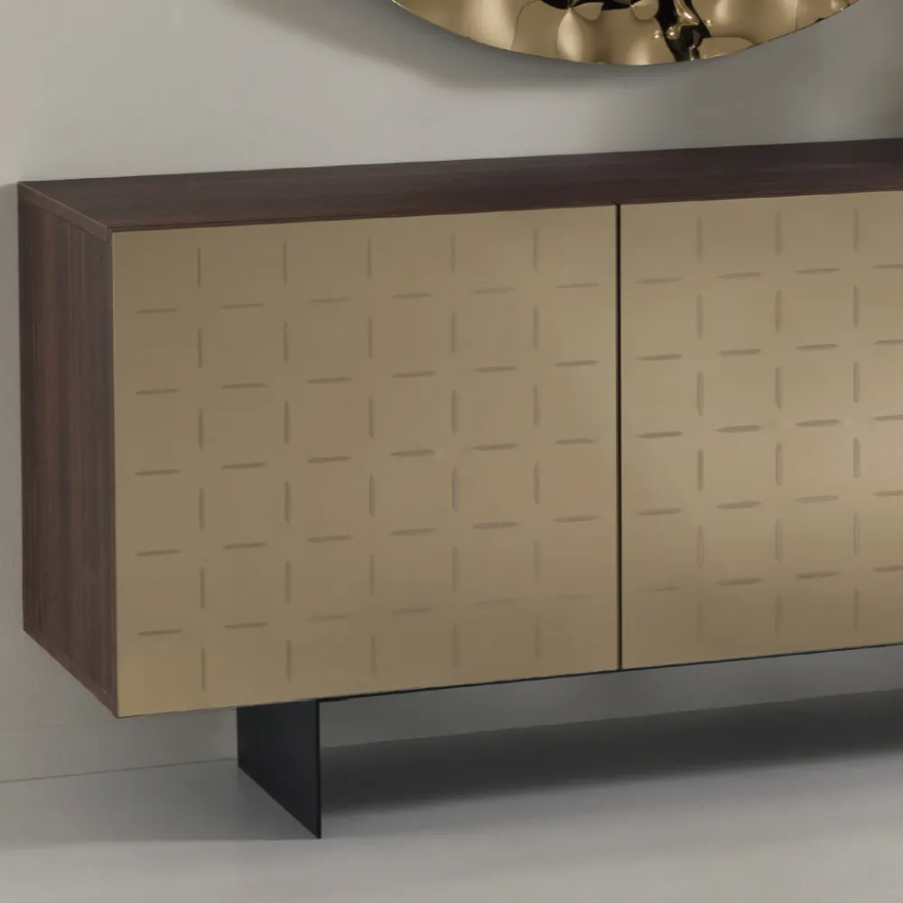 Die wunderbaren hochglanzpolierten Türen bereichern die Ästhetik des Produkts, indem sie dem gesamten Raum Licht und Brillanz verleihen, während die kreative Dekoration mit geometrischen Linien, die die Oberfläche charakterisieren, wesentlich ist, um ein Gefühl von Dynamik zu erzeugen und die strenge Form des Sideboards sanfter zu machen .