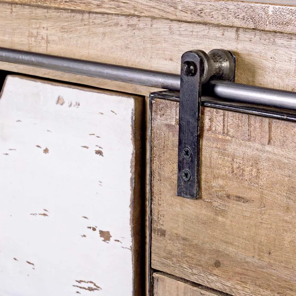 Sideboard aus Mangoholz, Stahl mit 2 Türen und 3 Schubladen.