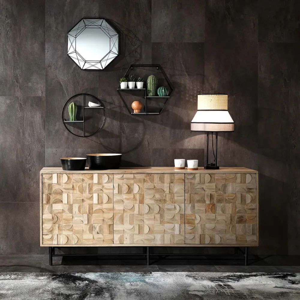 Wohnzimmer-Sideboard aus massivem Mangoholz, reich an Details und vollständig von Hand gefertigt, mit 3 Massivholztüren mit einer Dicke von 20 mm. mit Push-Pull-Öffnungssystem , Sockel aus mattschwarz lackiertem Stahl, H. 16 cm, Kippschutzsystem mit Verankerung an der Wand.