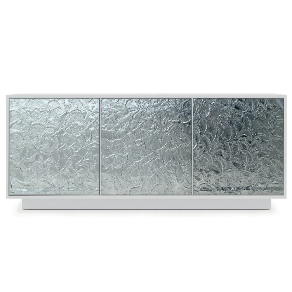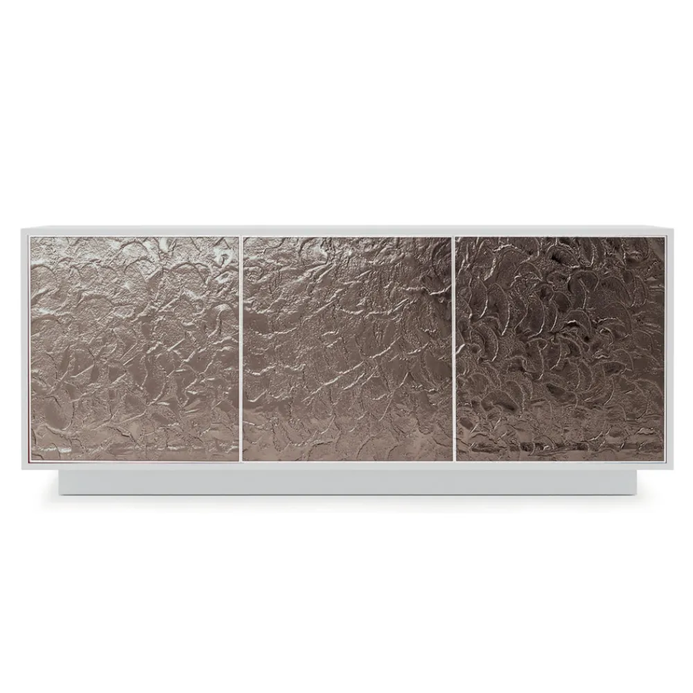 Wohnzimmer-Sideboard mit Struktur und Sockel aus mattweiß lackiertem Holz , 2 oder 3 Türen mit Aluminiumprofil und bearbeiteten Glasfronten , ausgestattet mit Push&Pull-Öffnungssystem und Innenregalen aus transparentem Hartglas (Stärke 6 mm, maximale Tragfähigkeit 20 kg), vollständig Hergestellt in Italien . Die perfekte Kombination aus der zeitlosen Eleganz von Glas und seiner originellen Verarbeitung mit der imposanten Note von Holz ergibt eine Ergänzung mit luxuriösem Design , die jedem Raum im Haus einen Hauch von exklusivem Stil verleiht. Seine Ästhetik entsteht aus dem Wunsch , Funktionalität und Eleganz zu einem Ergebnis mit moderner Persönlichkeit und starker szenografischer Wirkung zu verbinden, ideal für diejenigen, die einen raffinierten und avantgardistischen Einrichtungsstil lieben.