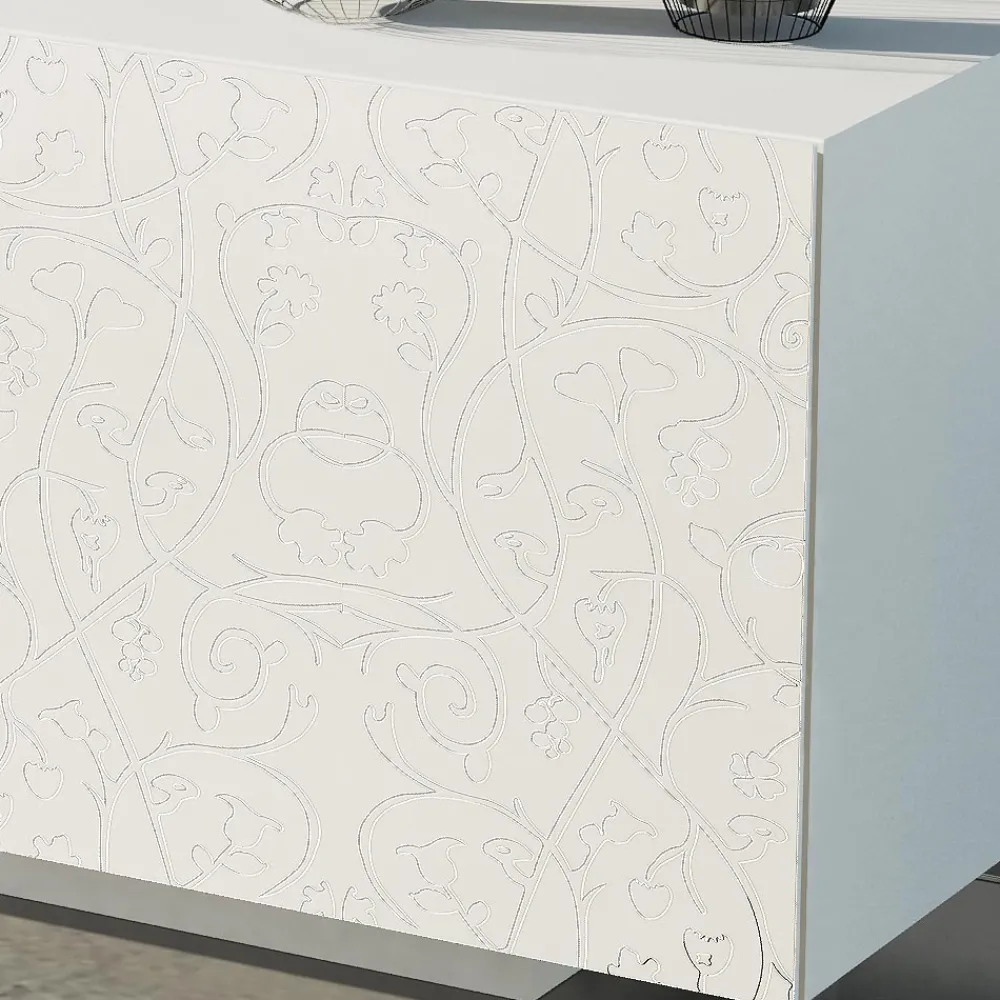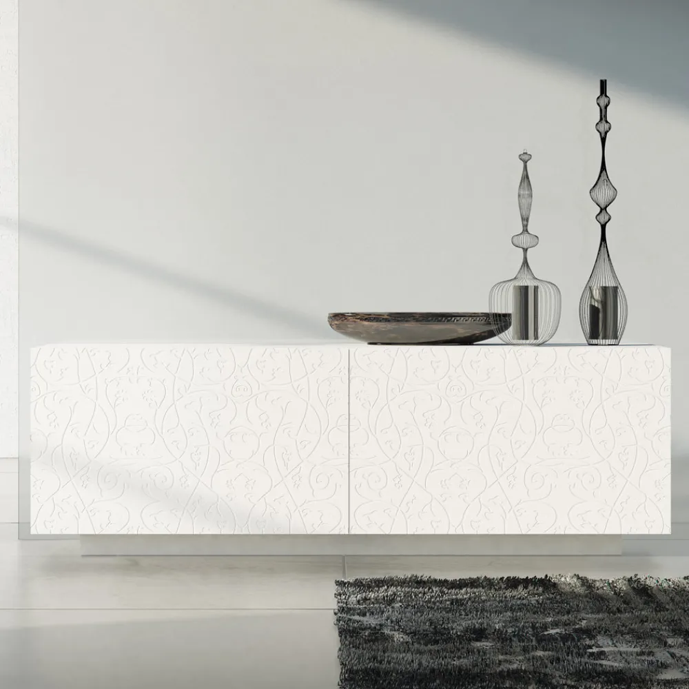 Modernes Sideboard mit weiß matt lackierter MDF- Struktur, bestehend aus 2 koplanaren Schiebetüren die hohe Funktionalität und Praktikabilität garantieren und vom lackierten Sockel , der viel Stabilität bietet. Dieses Produkt ist voller Geschmack und Design dank seiner eleganten und raffinierten Oberflächen und der Basrelief-Dekoration der Türen, die sie in ihrer Art einzigartig machen. Die verschiedenen Materialien, die für die Konstruktion verwendet werden, bieten eine hohe Qualität und Beständigkeit im Laufe der Zeit und verleihen dem Produkt eine einzigartige und unvergessliche Note.
