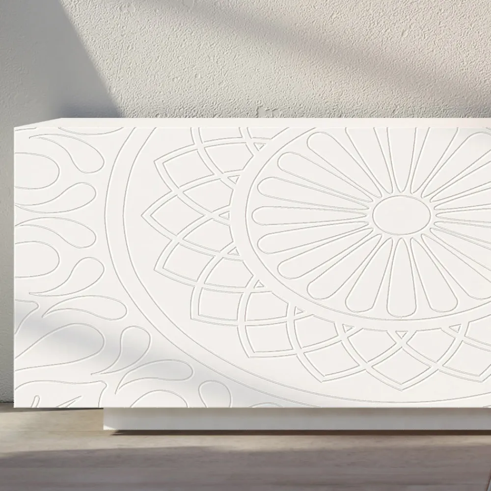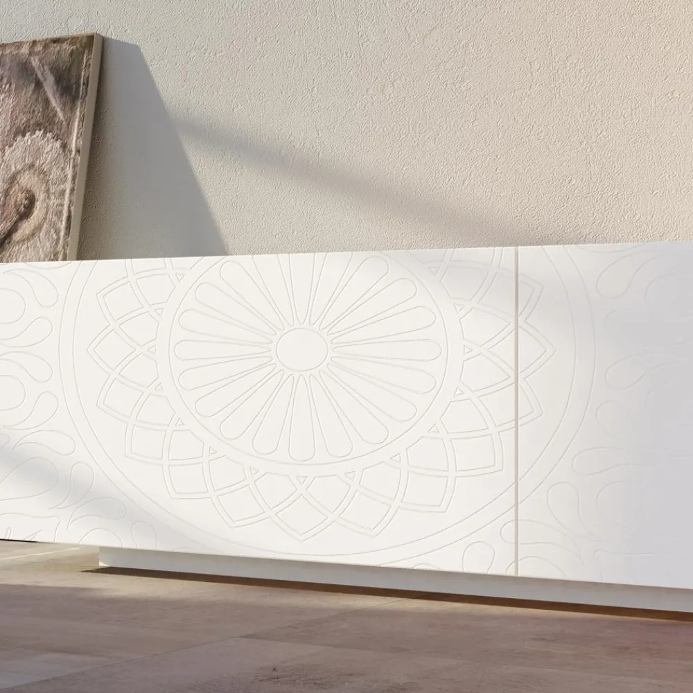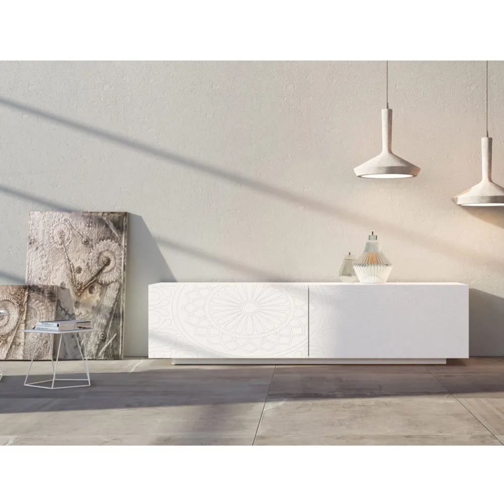 Modernes Sideboard mit weiß matt lackierter MDF- Struktur, bestehend aus 2 koplanaren Schiebetüren die hohe Funktionalität und Praktikabilität garantieren und vom lackierten Sockel , der viel Stabilität bietet. Dieses Produkt ist voller Geschmack und Design dank seiner eleganten und raffinierten Oberflächen und der Basrelief-Dekoration der Türen, die sie in ihrer Art einzigartig machen. Die verschiedenen Materialien, die für die Konstruktion verwendet werden, bieten eine hohe Qualität und Beständigkeit im Laufe der Zeit und verleihen dem Produkt eine einzigartige und unvergessliche Note.