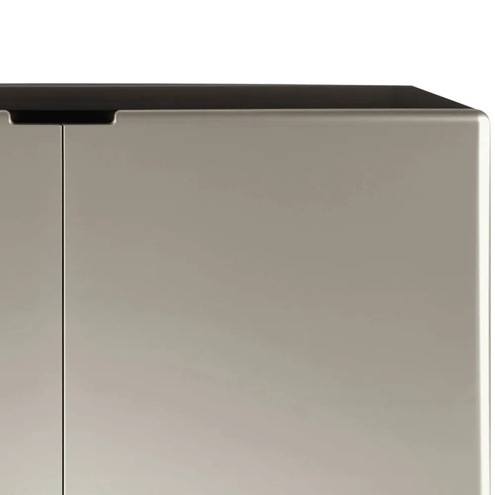 Wohnzimmer-Sideboard mit anthrazitfarbener Schale, Innenregalen und Türen aus MDF mit Nickel-Finish, Rückwand aus Sperrholz und Füßen aus vernickeltem Eisen , vollständig in Italien hergestellt.