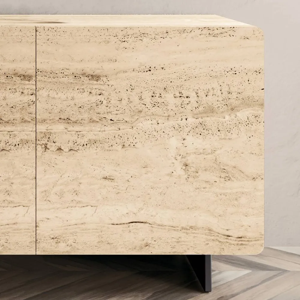 Wohnzimmer-Sideboard mit MDF- Korpus in Nerzoptik, anthrazitfarbenen Eisenfüßen, 2 Innenregalen aus MDF, Rückwand aus massivem Mehrschichtholz , 2 Türen aus MDF mit Travertin-Marmor- Finish, vollständig in Italien hergestellt. Das Produkt ist Teil der neuen Linie moderner Produkte, die mit Respekt vor der Natur hergestellt werden. Dieses elegante Sideboard zeichnet sich durch die Funktionalität und hohe Qualität italienischer Handwerkskunst aus.