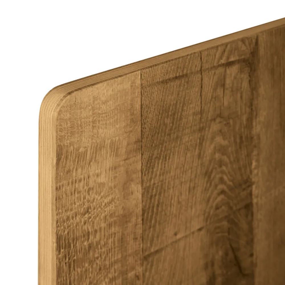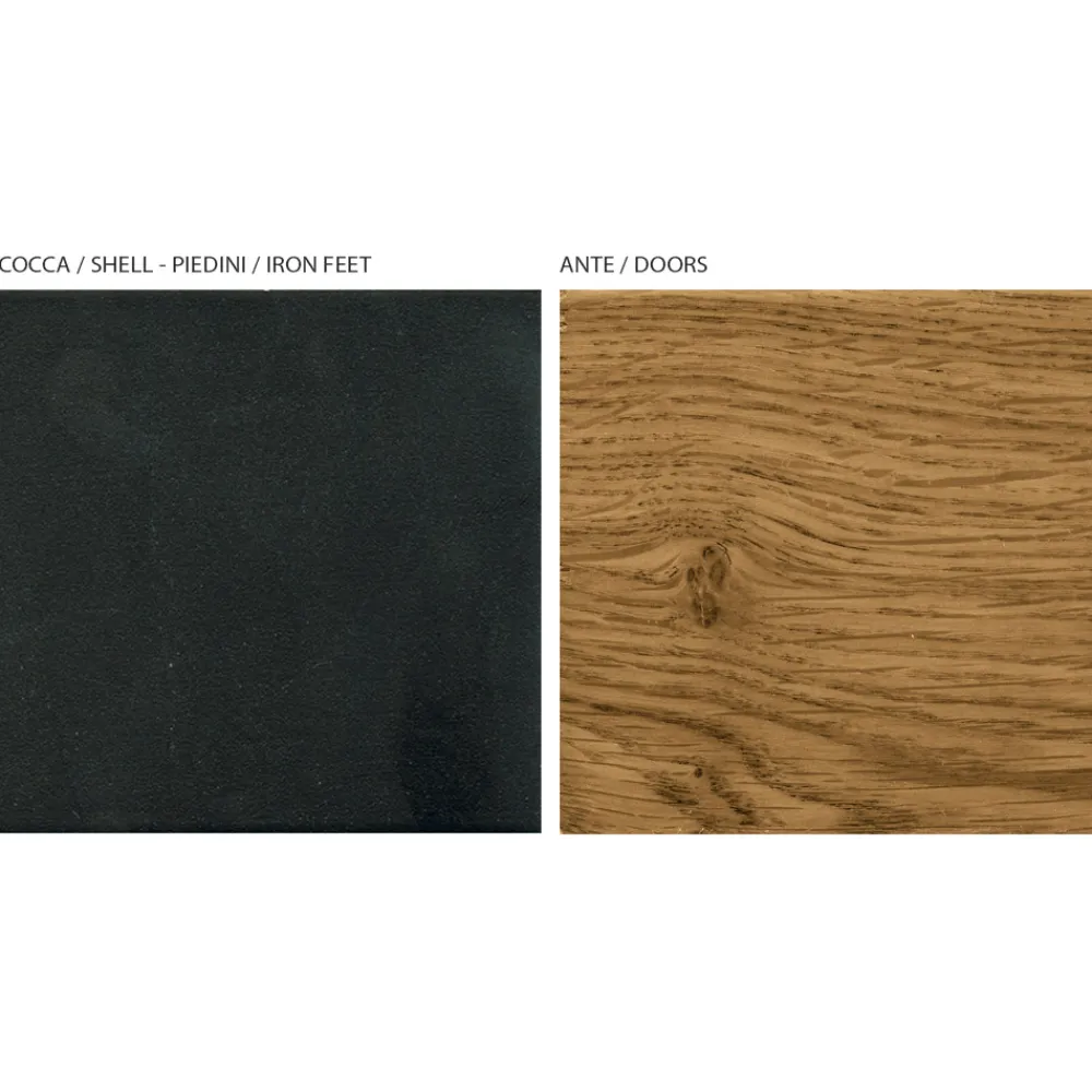 Komplett in Italien hergestelltes Wohnzimmer-Sideboard , bestehend aus Eisenfüßen in Anthrazit-Optik , MDF-Schale in Anthrazit-Optik , Rückwand aus massivem Holz mit 3 Türen aus Tischlerplatte aus geknoteter Eiche mit vertikaler Maserung in rustikaler Eiche-Optik mit Innenregalen aus MDF .