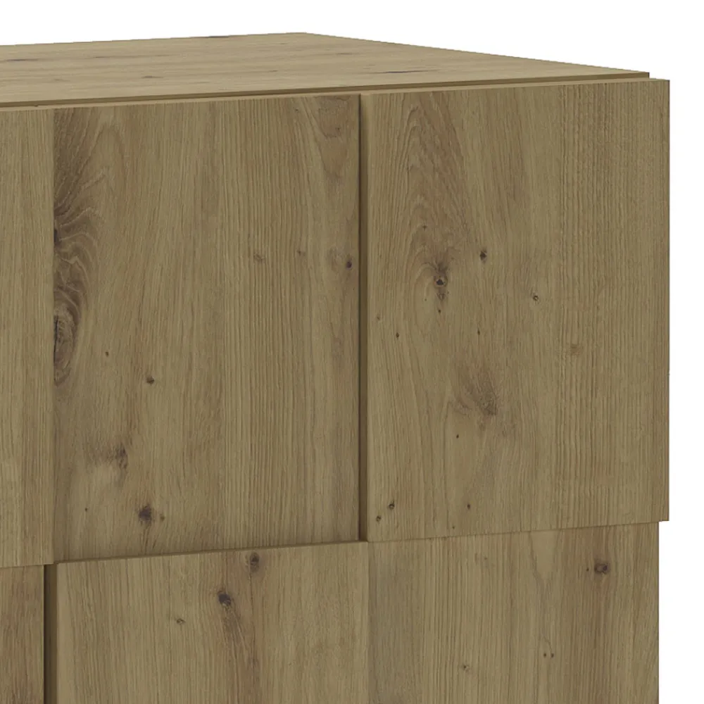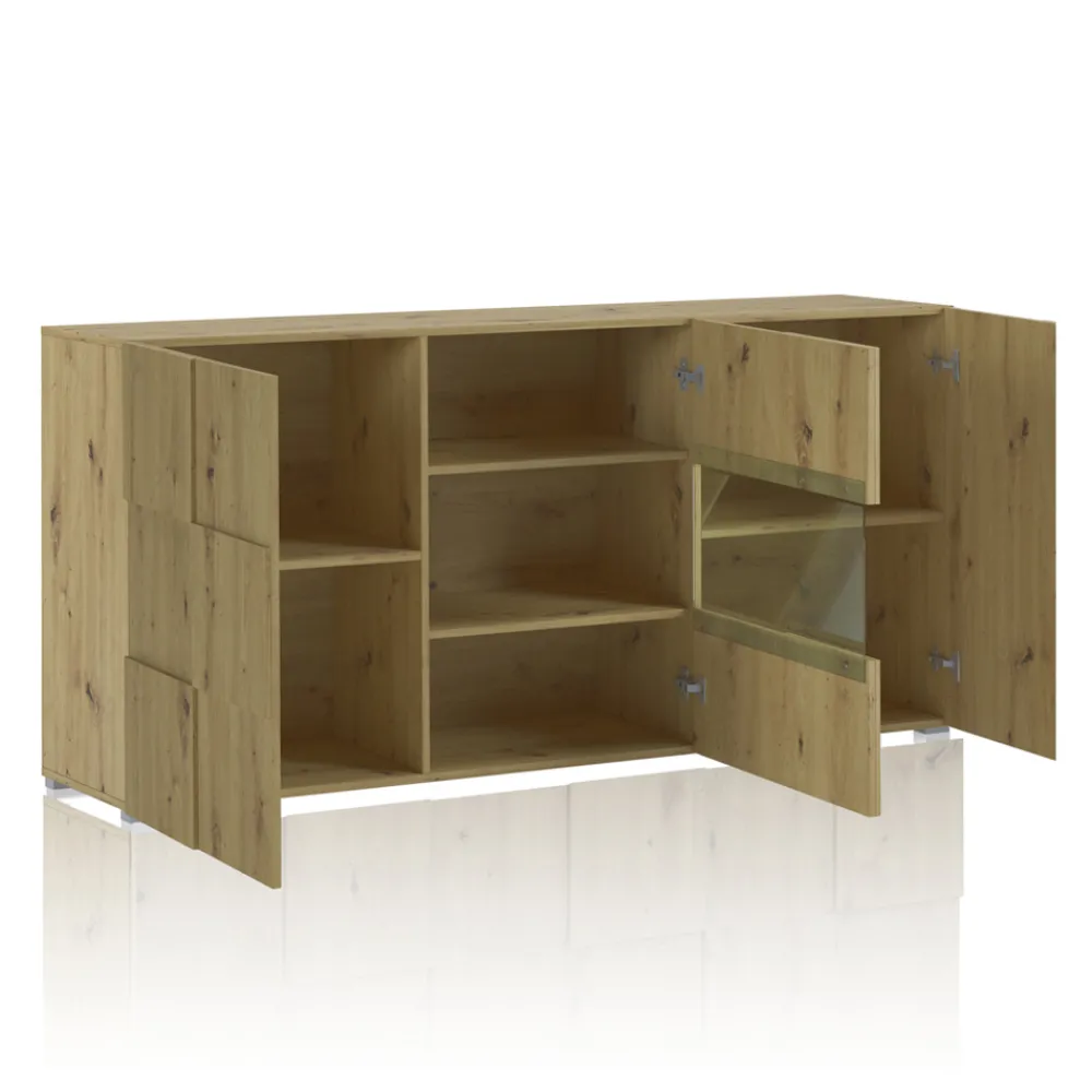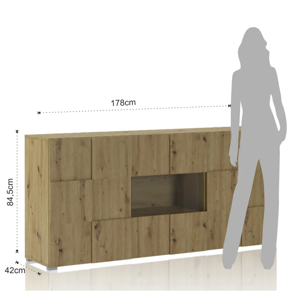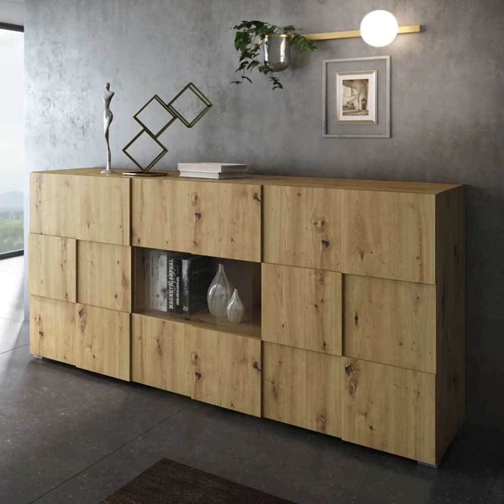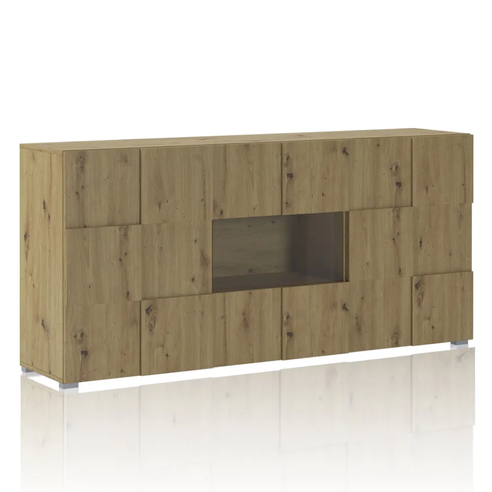 Wohnzimmer-Sideboard aus ökologischen Spanplatten mit Melaminbeschichtung in Eichenoptik , mit 4 Flügeltüren und einem offenen Fach.
