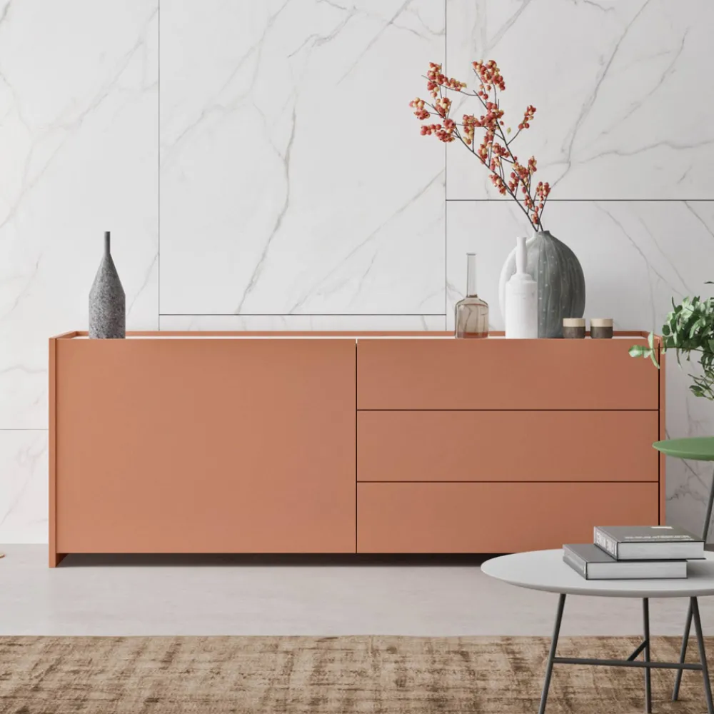 Dieses Sideboard für das Wohnzimmer hat eine Struktur und Seiten in Zimt-Mattlack mit einer eleganten Carrara-Venatino-Marmorplatte.